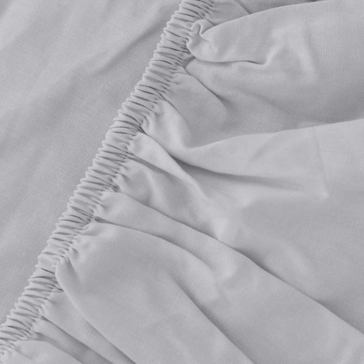 Jasnoszare prześcieradło jest uszyte z miękkiego i gładkiego w dotyku materiału.