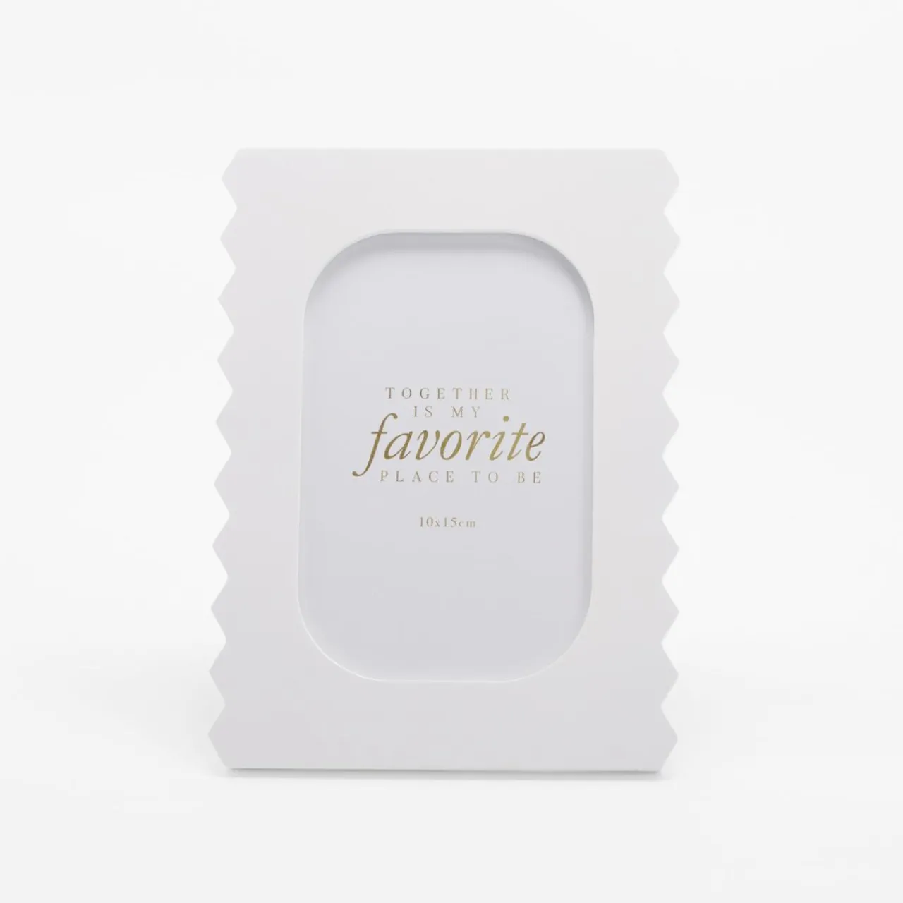 Dodaj swojemu wnętrzu subtelny akcent dzięki białej ramce na zdjęcie o ząbkowanym kształcie, która łączy nowoczesną prostotę z dekoracyjnym detalem. Doskonała, by wyeksponować najcenniejsze wspomnienia, wnosząc do pomieszczenia delikatny, a zarazem stylowy element.