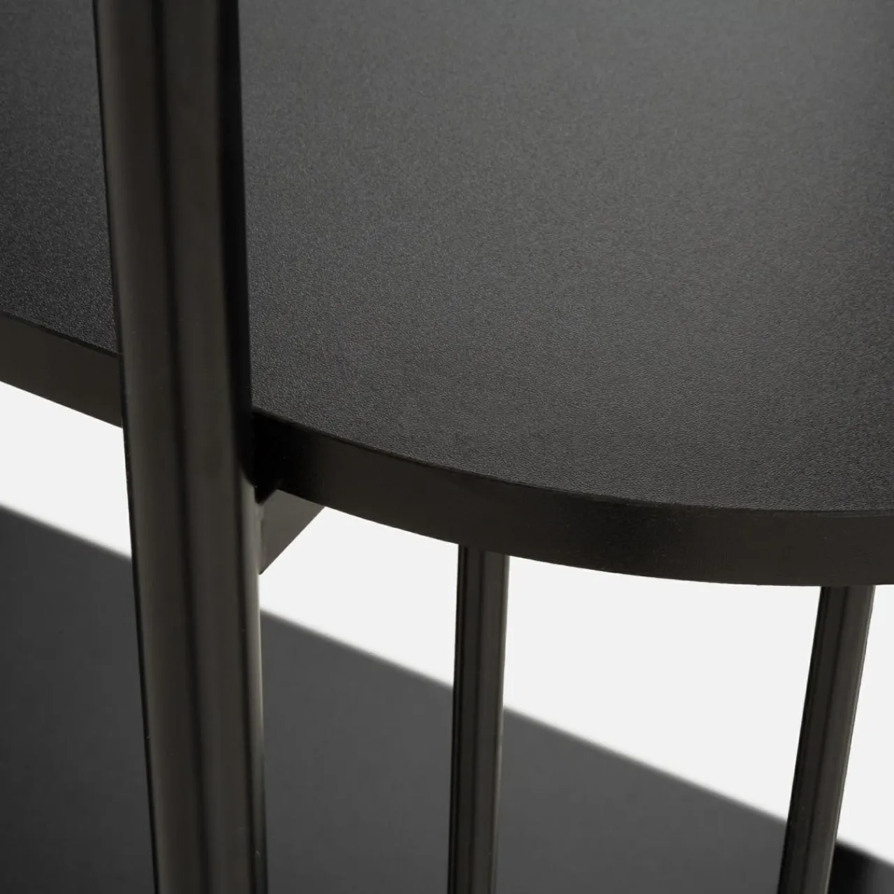 Prosty design i ciemna tonacja przyciągają uwagę – metalowa rama i półki z imitacji drewna nadają minimalistyczny, ale wciąż mocny charakter.