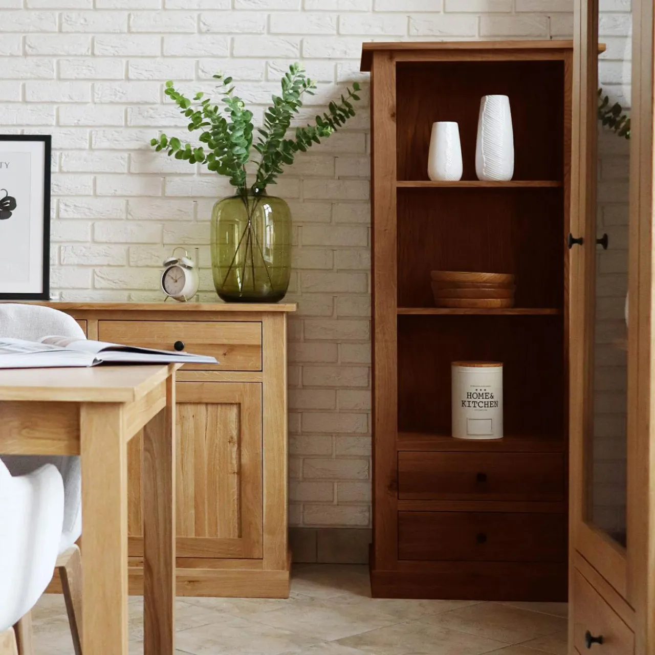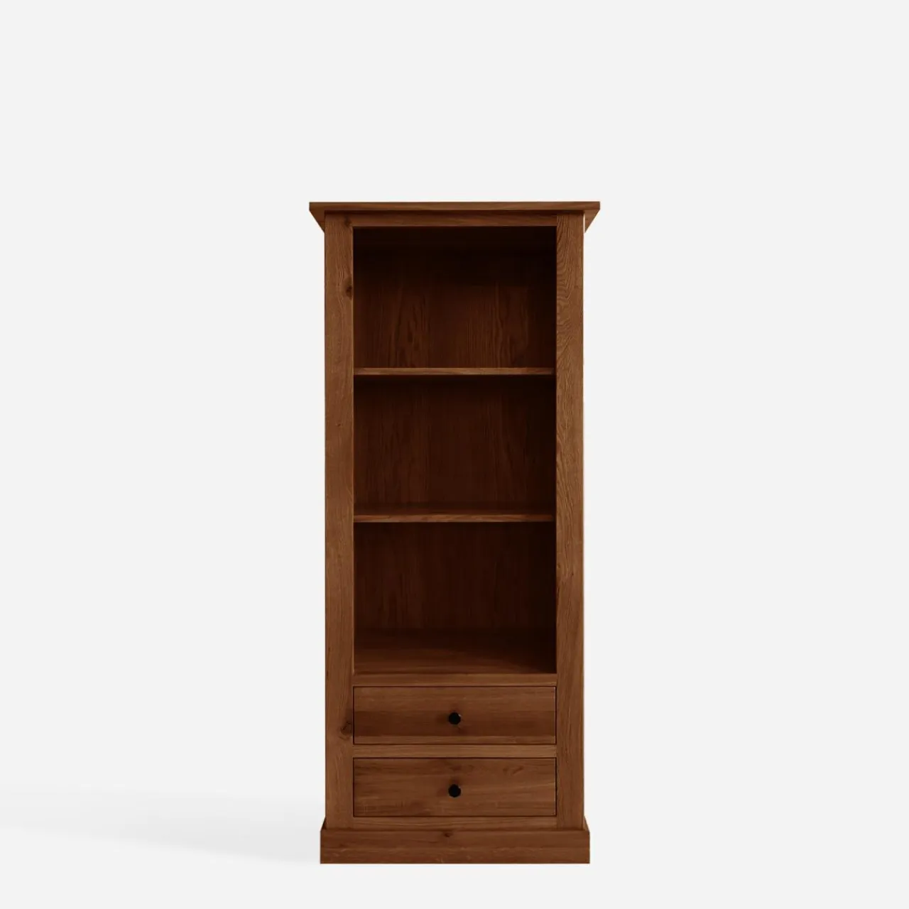 Regał niski STELLA to praktyczny mebel wykonany z litego drewna w kolorze dąb koniakowy. Jego kompaktowa wysokość oraz połączenie otwartych półek i szuflad czynią go idealnym wyborem do salonu, gabinetu, a nawet pokoju dziecięcego.