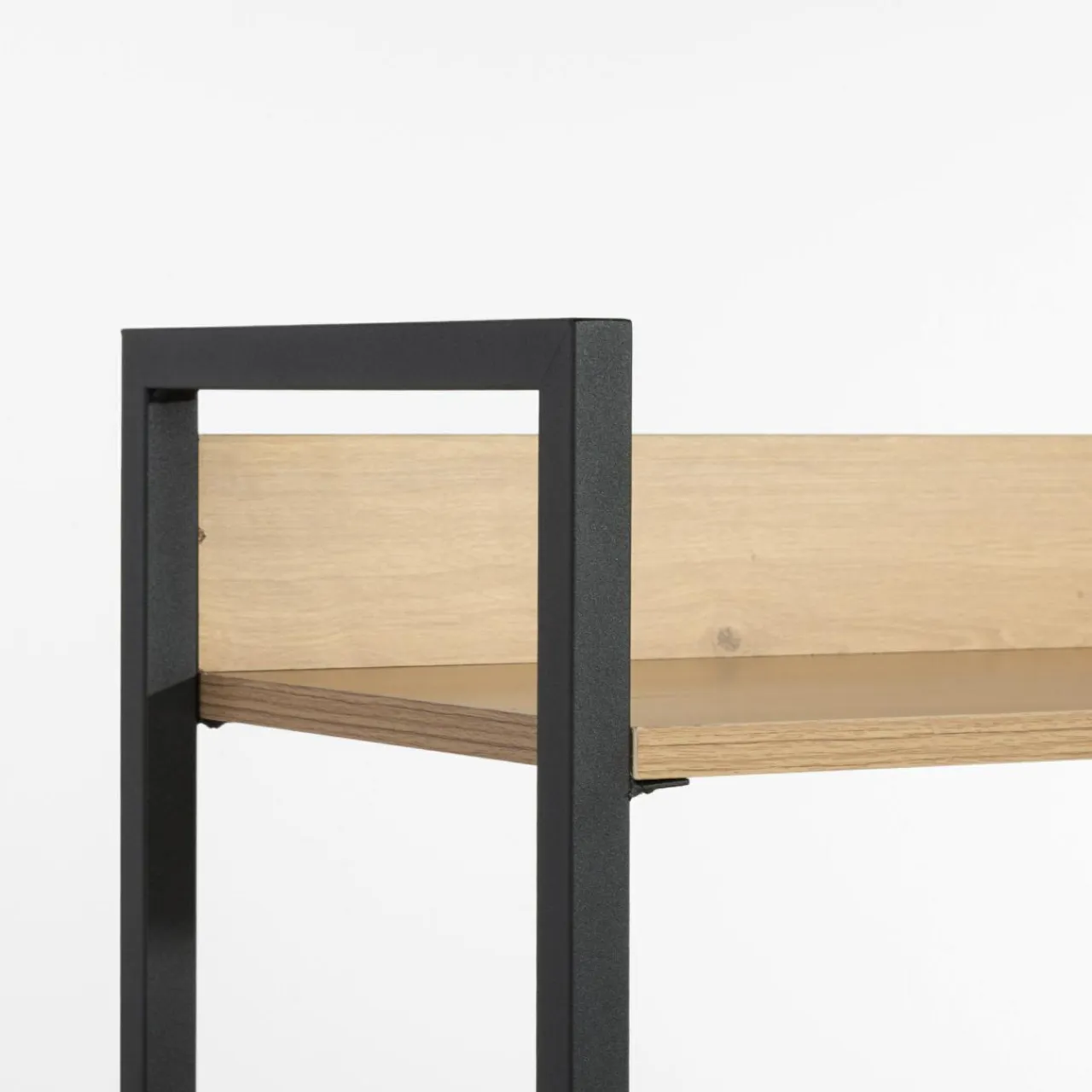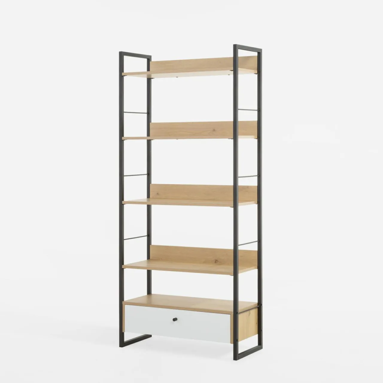 - Industrialny styl – metalowa rama w czarnym kolorze połączona z jasnym wykończeniem półek i szuflady tworzy nowoczesny wygląd.