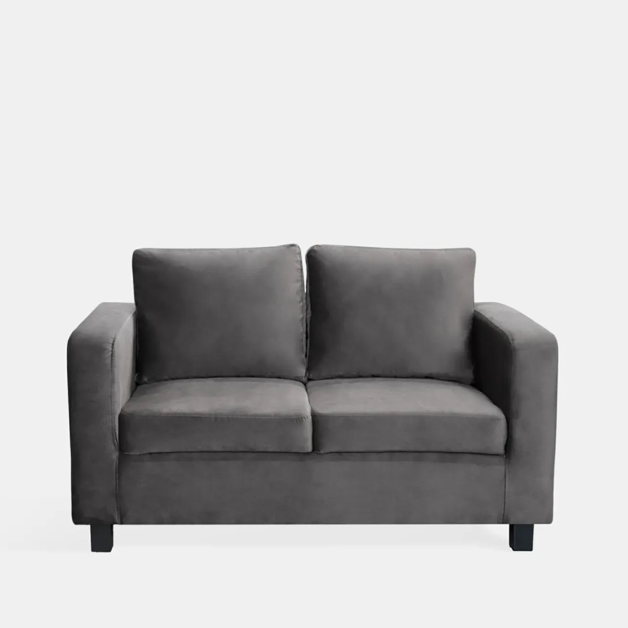 Sofa 2-osobowa MINI MAX II w stalowym odcieniu łączy elegancję z komfortem, a delikatny połysk pluszu nadaje jej przytulnego charakteru.