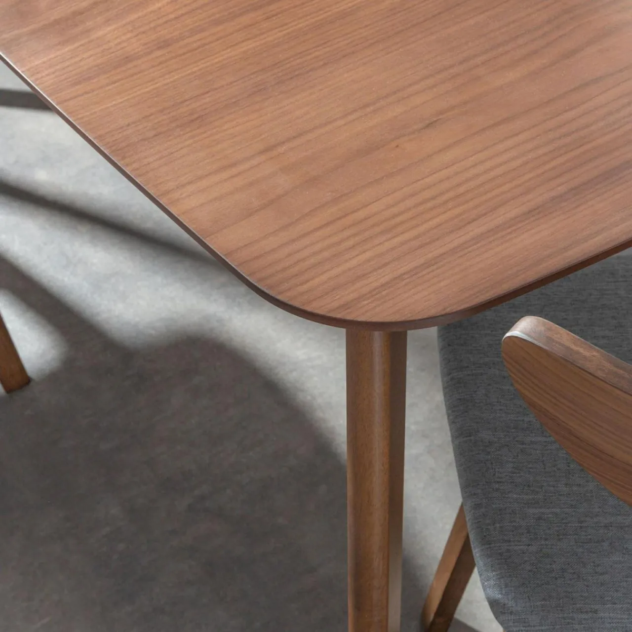 Konstrukcja stołu WALVA łączy blat z forniru orzechowego i drewniane nogi. Naturalne materiały wprowadzą do wnętrza przytulny i ciepły charakter.