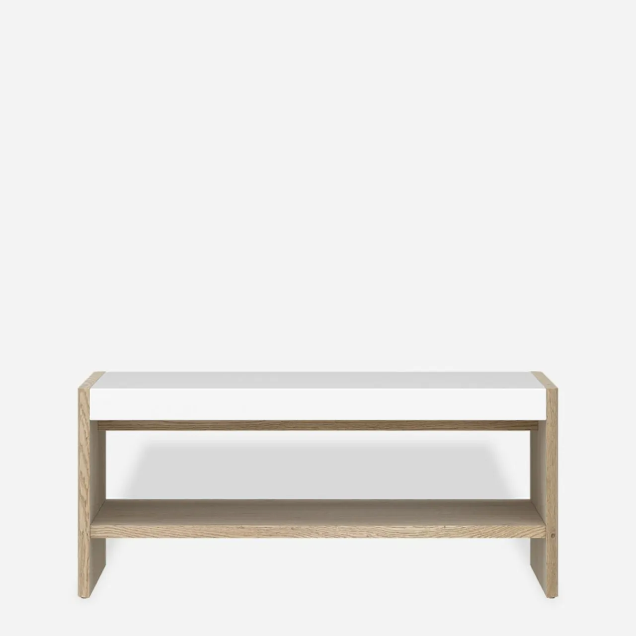 Stolik CALIMA w kolorze dąb Cremona oraz biały idealnie sprawdzi się w jasnych i nowoczesnych przestrzeniach, dodając lekkości aranżacji. Dzięki prostemu designowi i praktycznym rozwiązaniom, ten stolik jest wyborem dla osób ceniących estetykę i porządek.