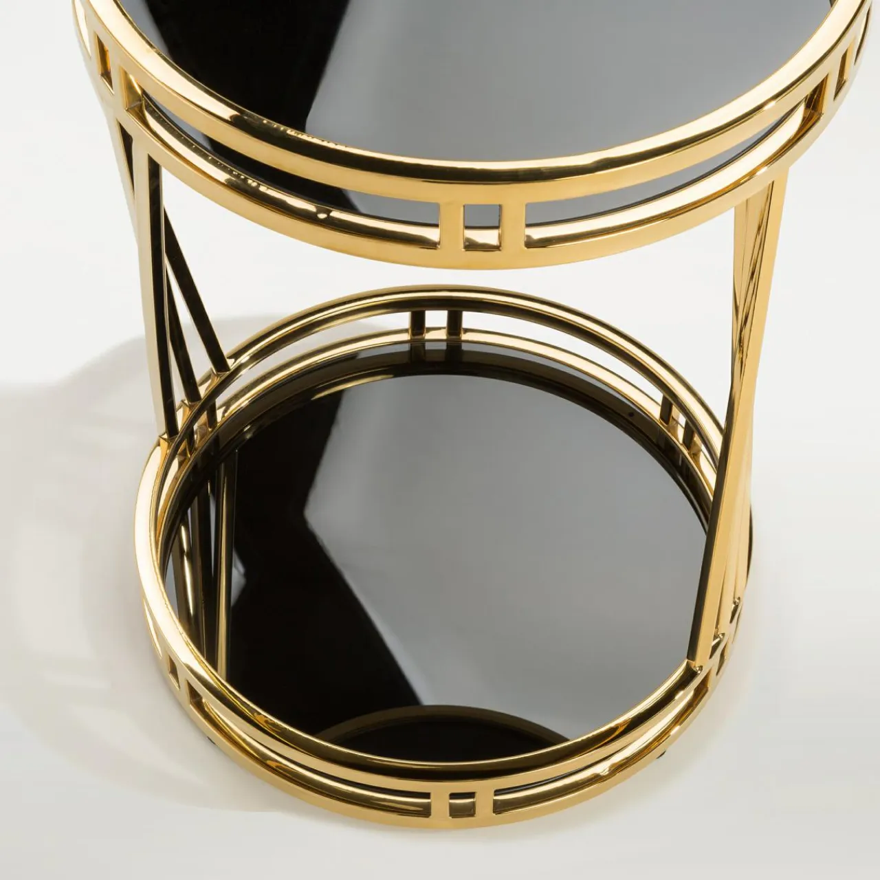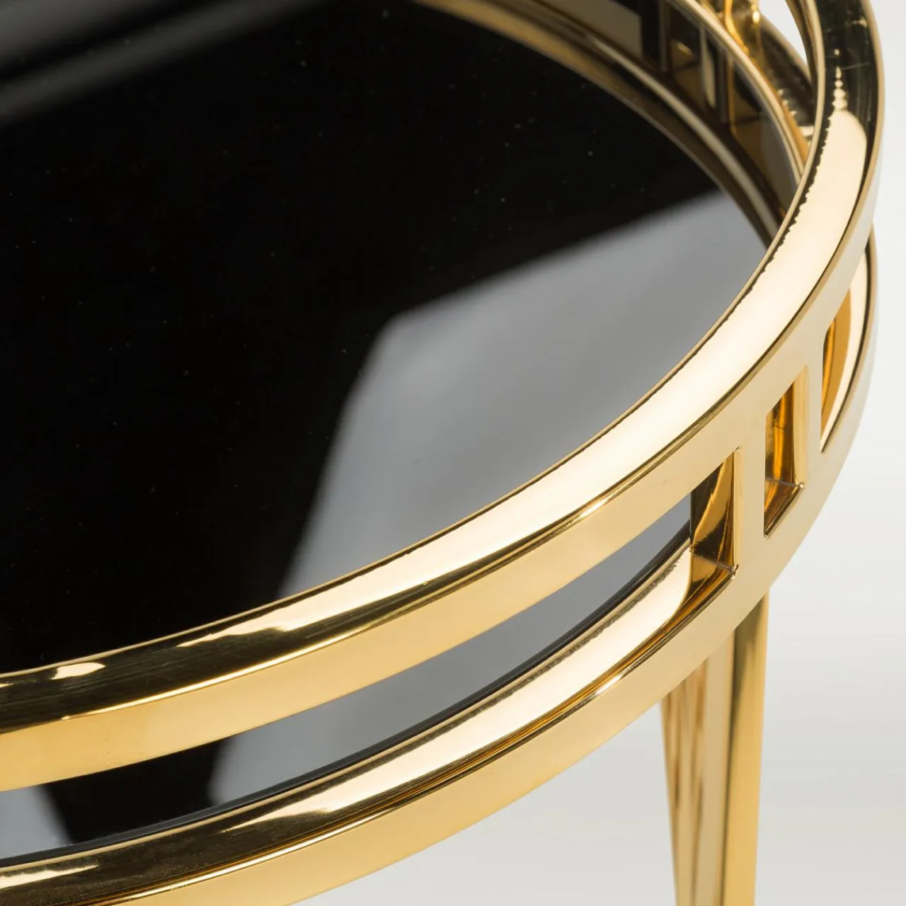 Stolik ENIOCOZI emanuje elegancją dzięki połączeniu czarnego szkła hartowanego ze złotym stelażem.