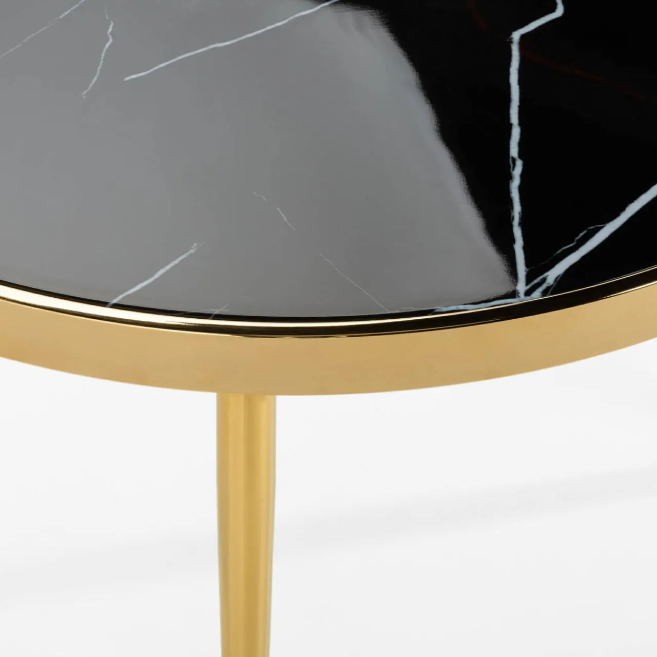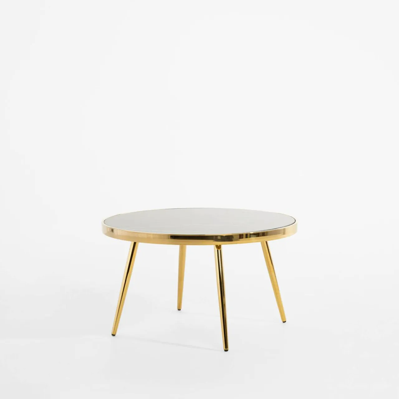 Ze stolikiem kawowym EFUZZO zamienisz swój pokój dzienny w nowojorski apartamentowiec. Stolik łączy w sobie szklany blat z marmurowym dekorem i konstrukcję ze złotej stali nierdzewnej.