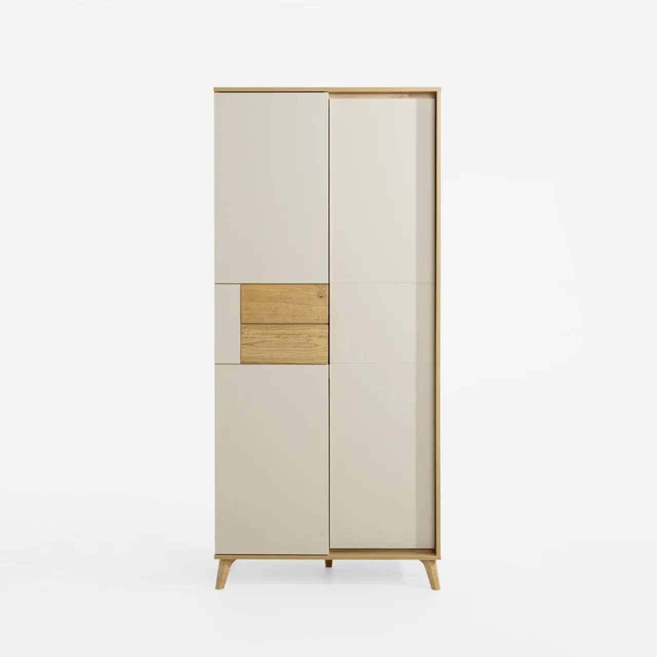 Beżowe bryły rozjaśnią wnętrze, a fronty ze wstawkami z prawdziwego drewna w kolorze dąb artisan nadadzą naturalnego akcentu.