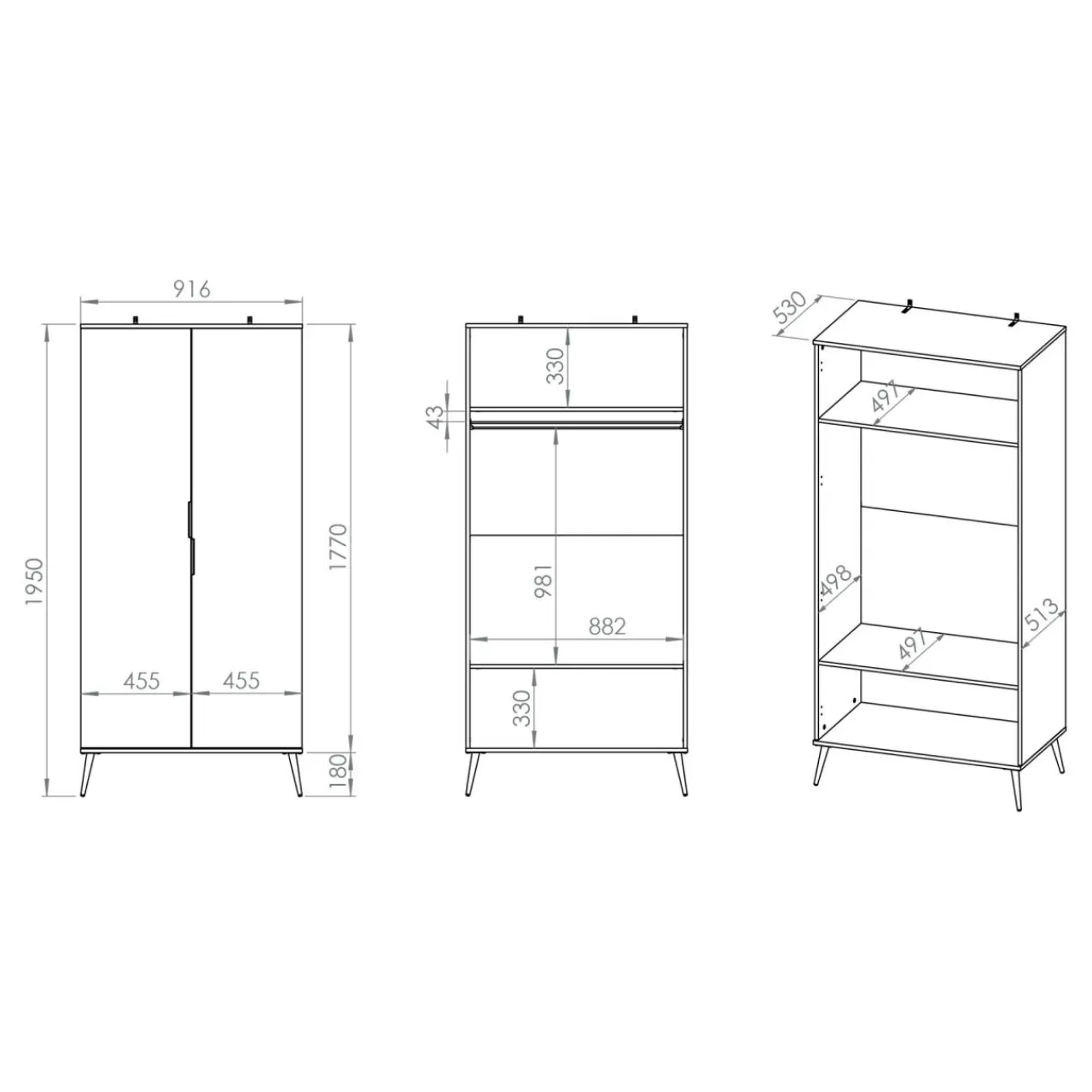 Z szafą VITERBO wszystkie kurtki, płaszcze lub koszule w jednym miejscu. Pozostałą część lub dodatki poukładaj w 2 szerokich wnękach.