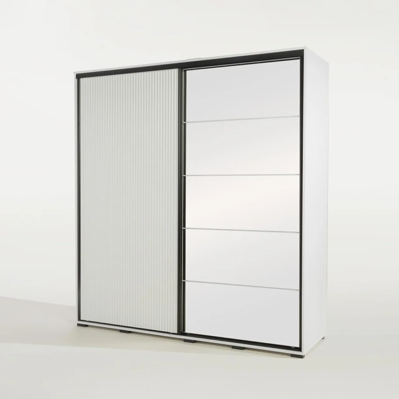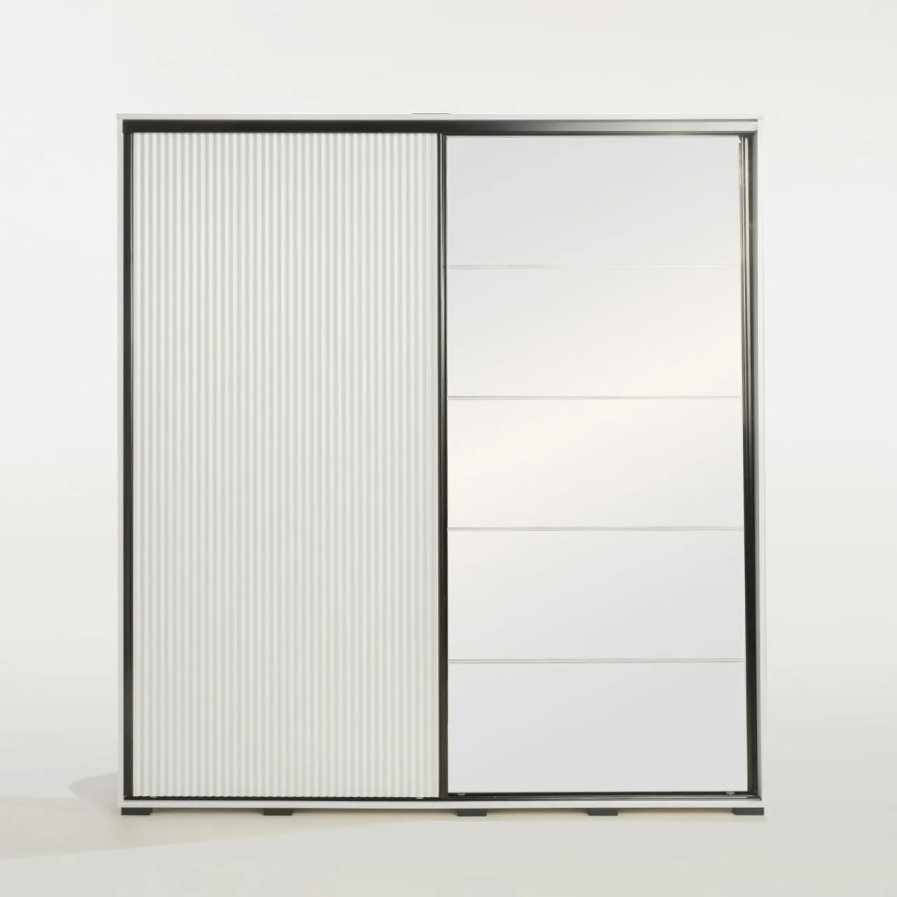 Czarna rama nadaje ciekawy kontrast. Szafa wpasuje się w minimalistyczne i nowoczesne sypialnie o stonowanych kolorach ścian,