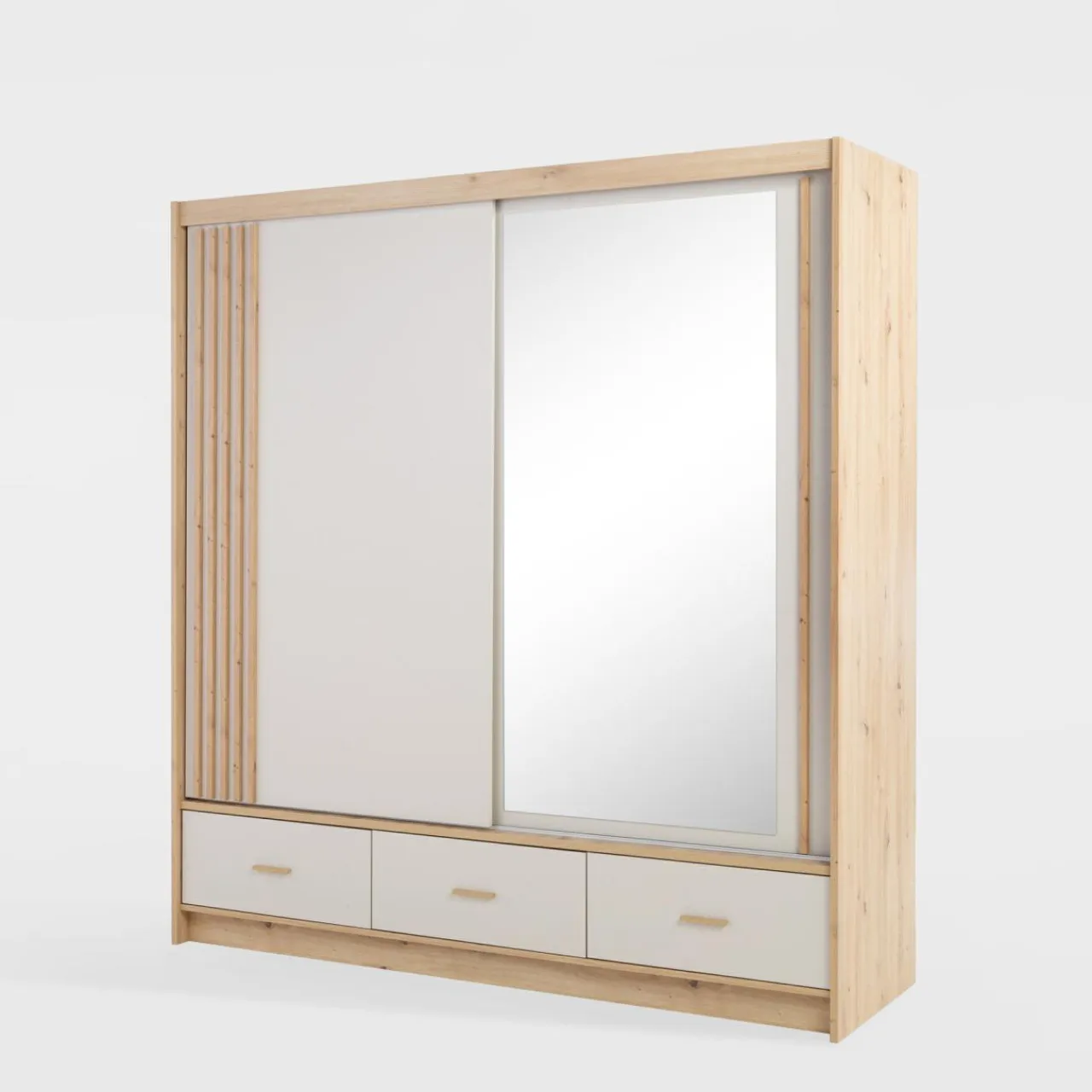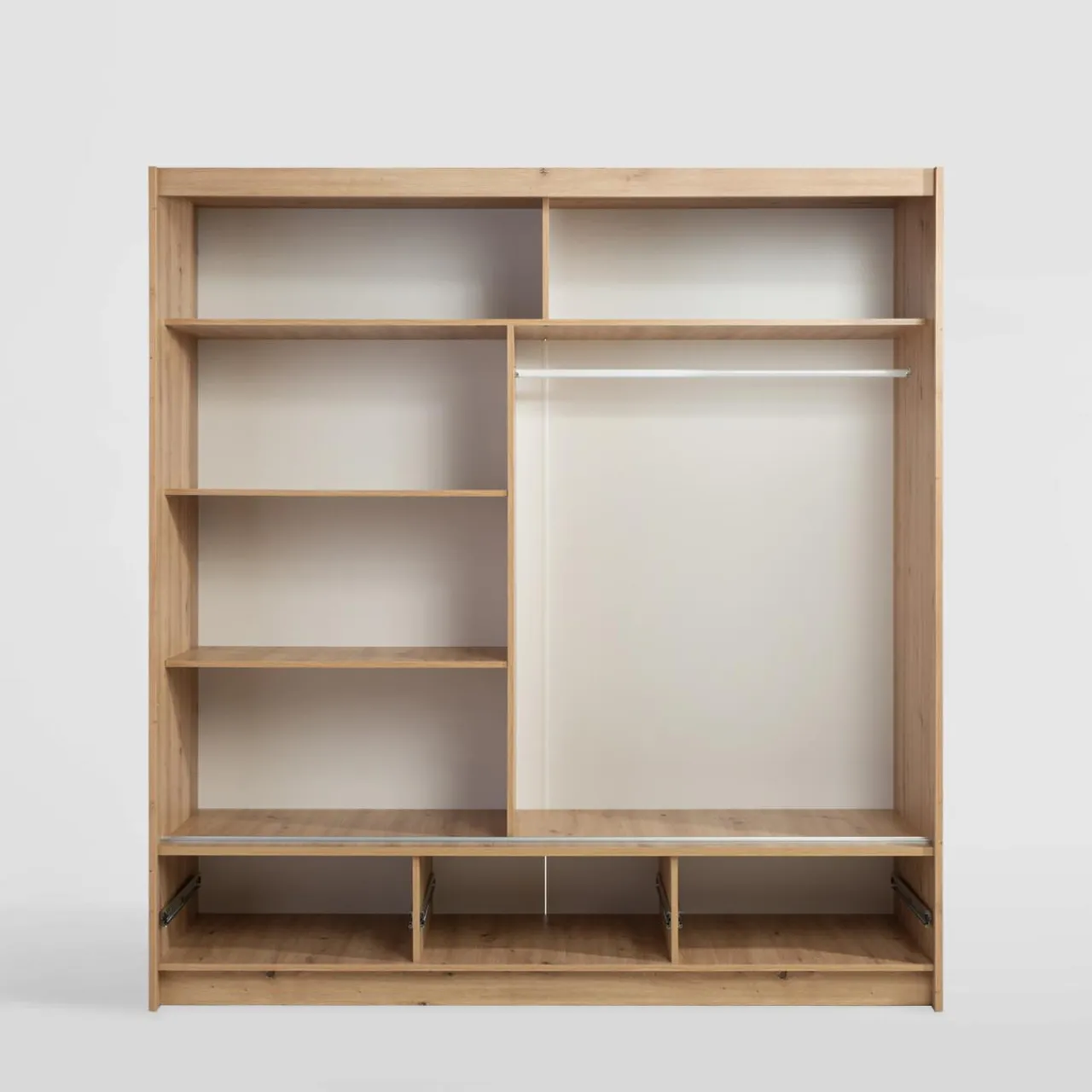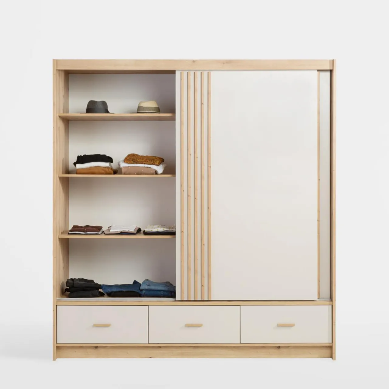 W szafie NEVADA wszystko będzie na swoim miejscu. Ubrania i dodatki poukładasz na półkach, a bieliznę i pozostałe przedmioty schowasz w 3 szufladach.