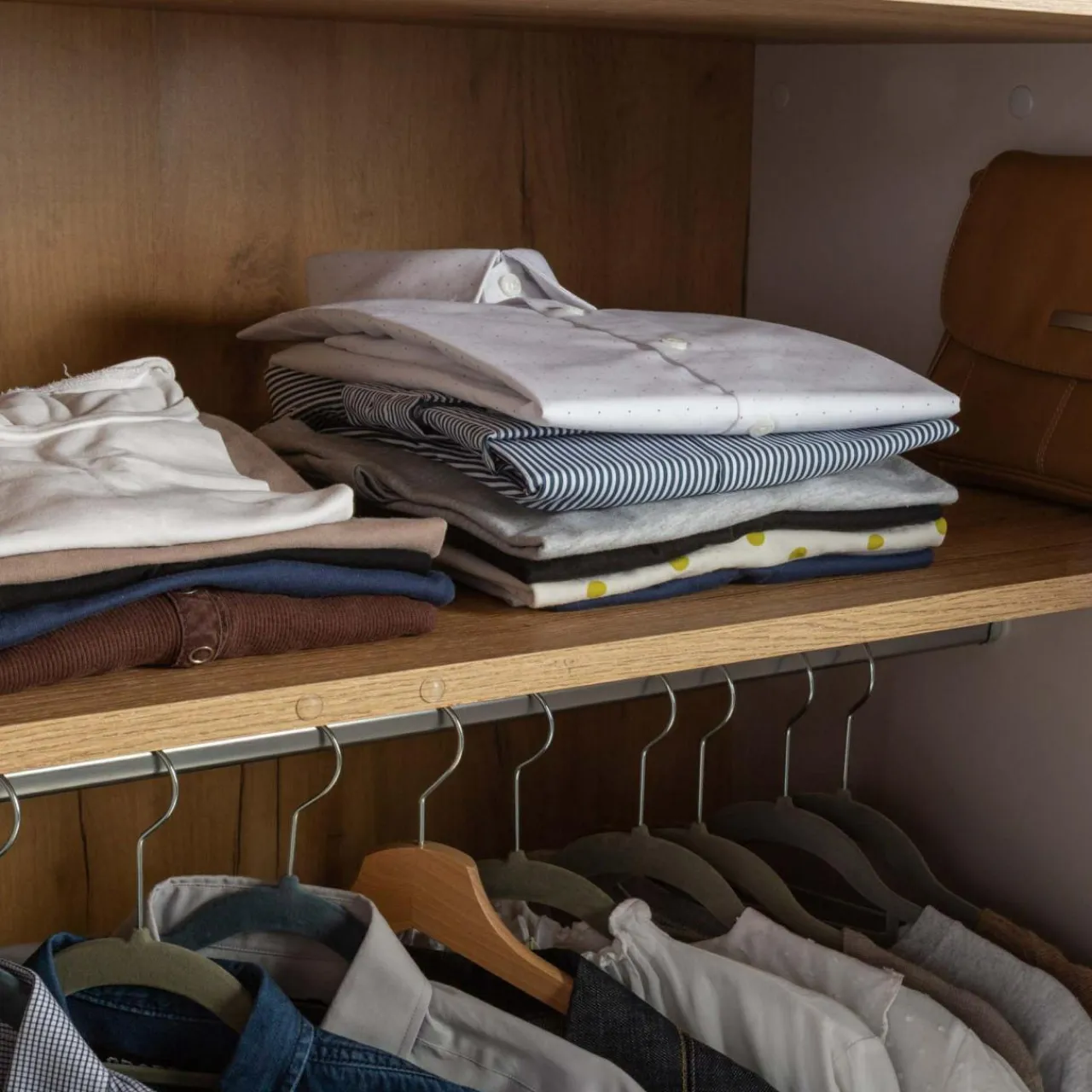 - Resztę ubrań ułożysz na górnej półce. Pojemna wnęka sprawdzi się również na odzież sezonową.