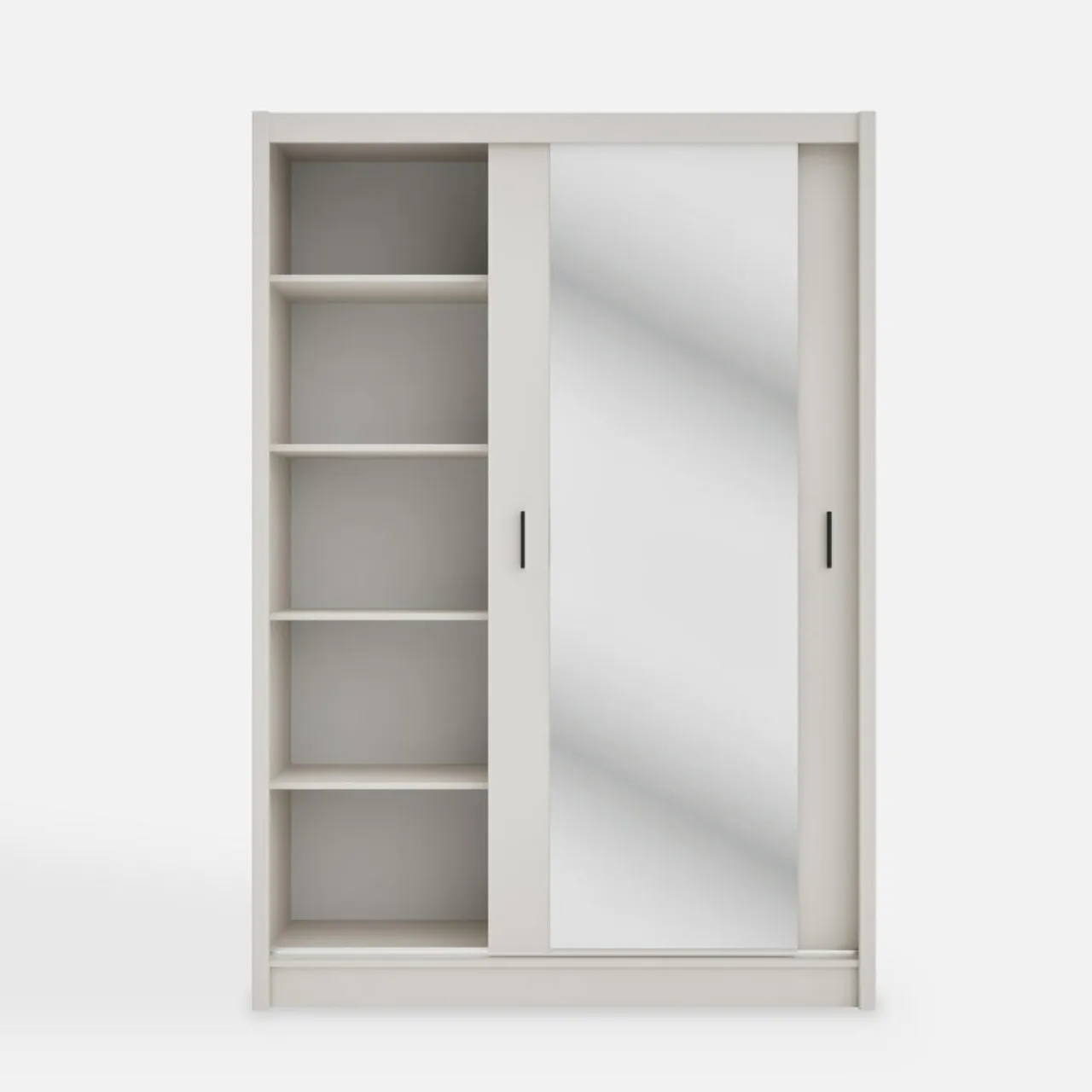 Szafa przesuwna z lustrem NESS o szerokości 150 cm w kolorze kaszmir to praktyczne rozwiązanie do sypialni, garderoby lub przedpokoju.