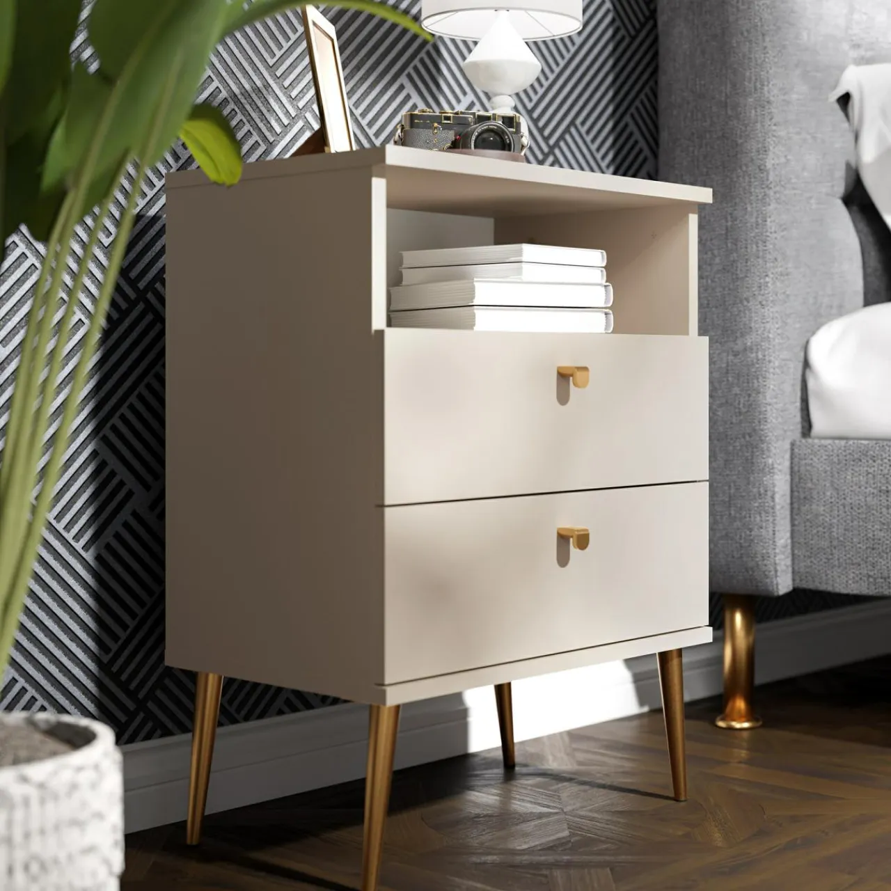 - Beżowy mebel stworzy przytulny kącik przy łóżku. Ciepły odcień jest przyjemny dla oka, wprowadza spokój do pomieszczenia.