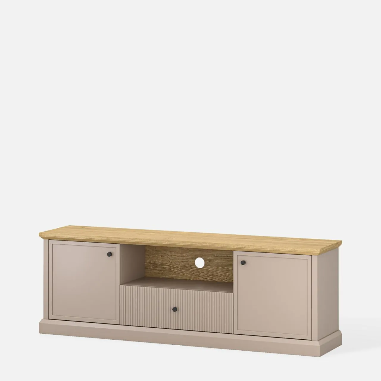 Szafka pod telewizor IDELLO w odcieniach taupe i dębu kamiennego to mebel, który idealnie sprawdzi się w nowoczesnym salonie, tworząc wygodną przestrzeń wokół telewizora.