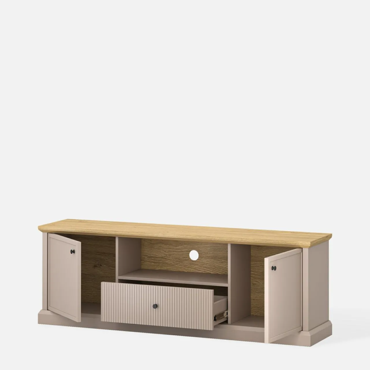 - Otwór na kable – otwór w tylnej ściance szafki umożliwia estetyczne przeprowadzenie kabli, co sprawia, że przestrzeń wokół telewizora pozostaje uporządkowana.