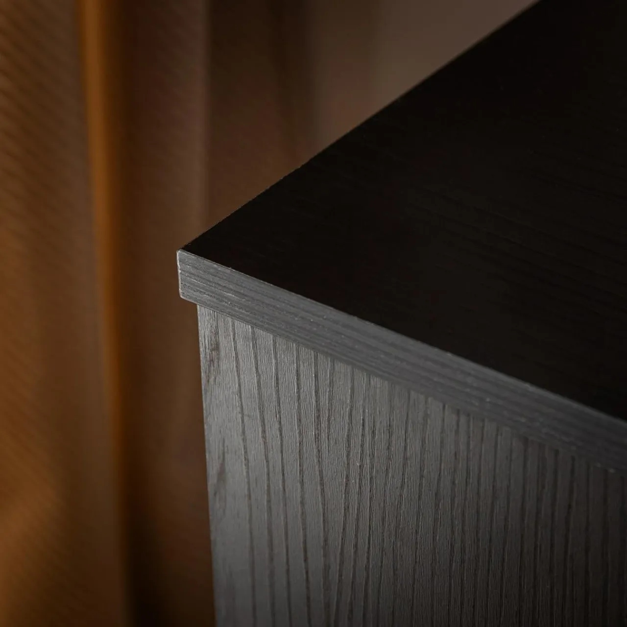 - Meble charakteryzuje czarne wykończenie. Ciemną i elegancką kolorystykę dopełnia rysunek drewna.