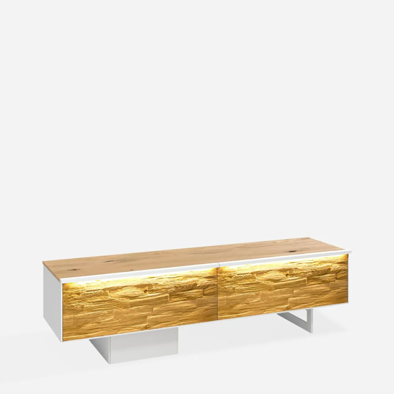 - Zanurz się w grze świateł i faktur — wbudowane oświetlenie LED w ciepłej tonacji wydobywa rysunek dębu, podkreślając ich unikalną strukturę.