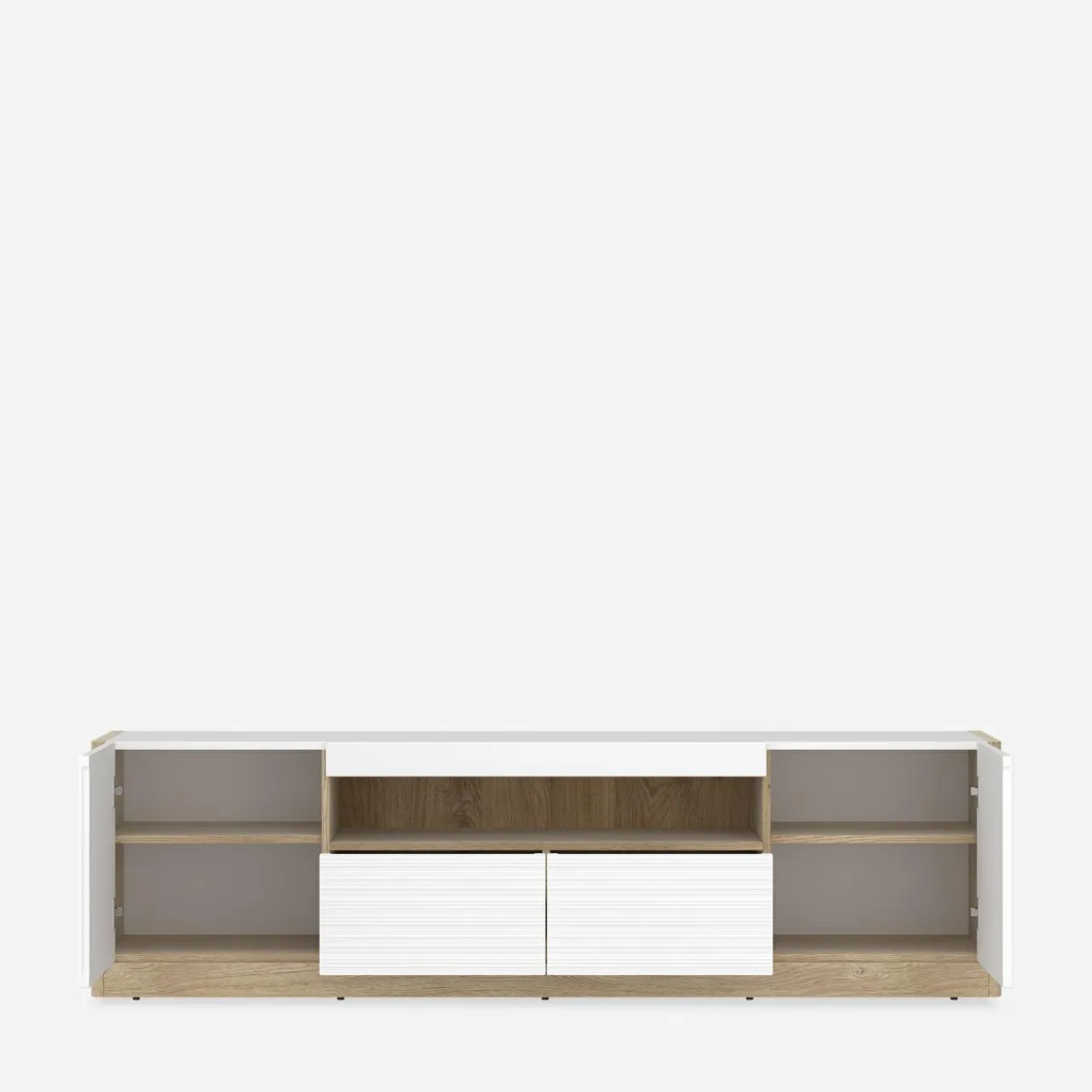 - 2 szuflady i 2 szafki z drzwiczkami – zapewniają dużo miejsca na przechowywanie kabli, pilotów czy kolekcji płyt, pomagając w utrzymaniu porządku.