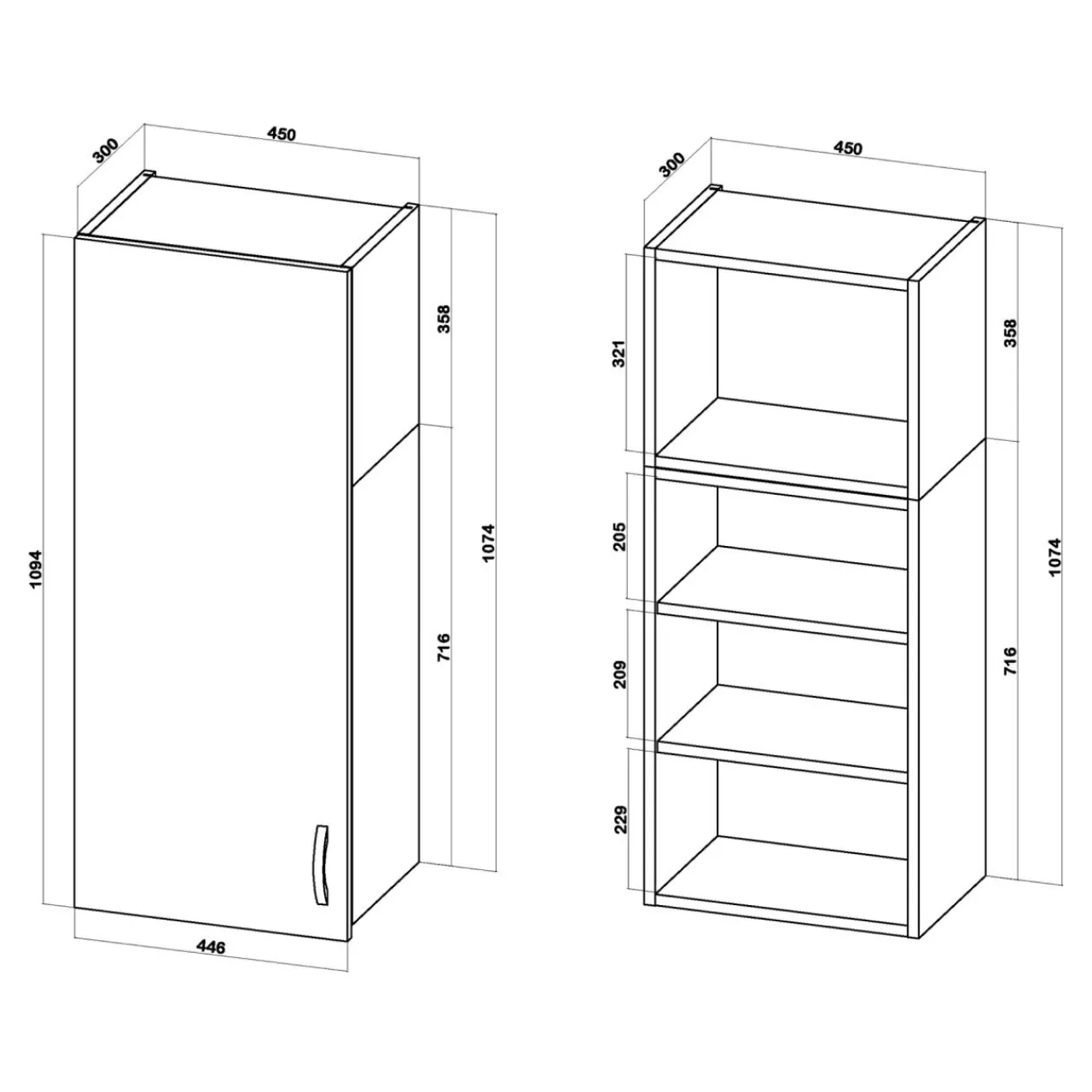- Wysoka na 108 cm bryła mebla podzielona jest na 4 wnęki. Pozwala na intuicyjnie rozmieszczone naczyń oraz produktów żywnościowych.