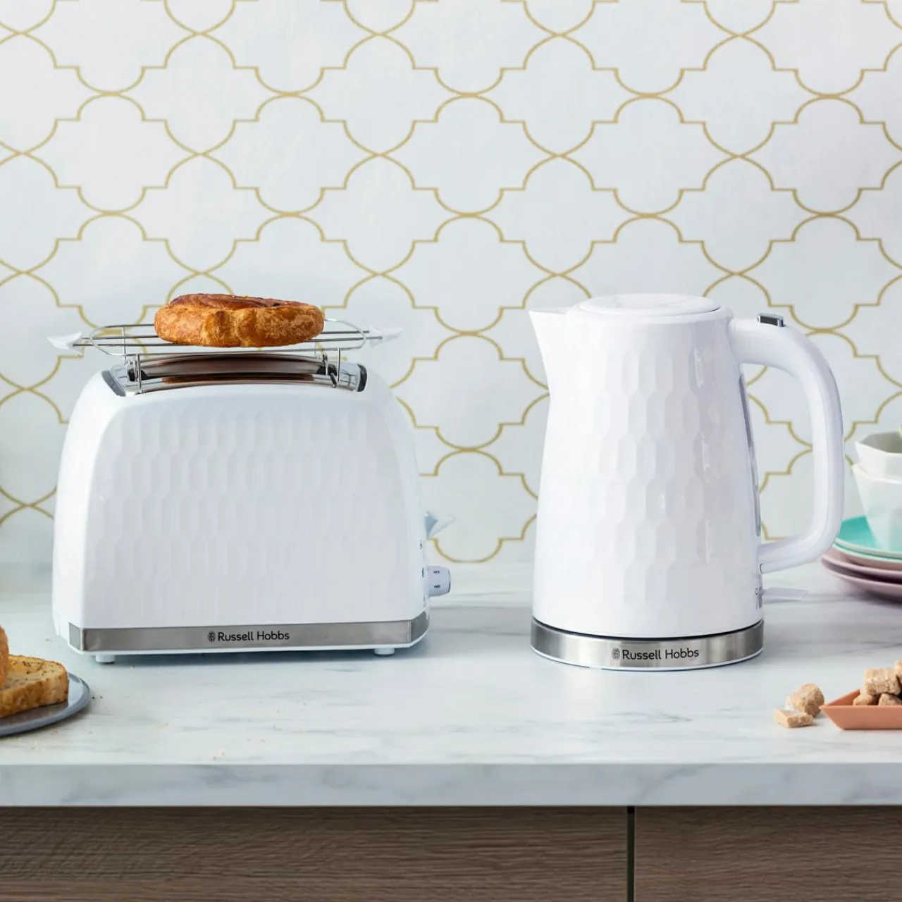 Dodaj swojej kuchni wyjątkowy akcent dzięki tosterowi z 2 szczelinami HONEYCOMB z eleganckim wykończeniem Premium White Plastic o strukturze plastra miodu. Zapewnij sobie idealne tosty każdego ranka w stylowy sposób!