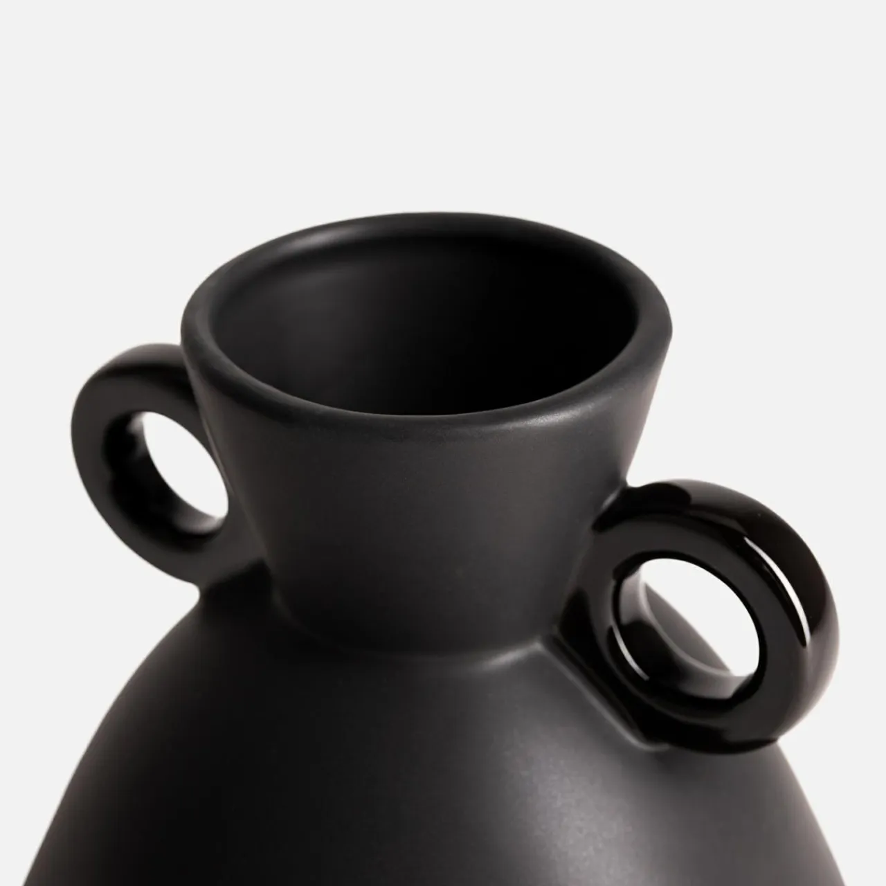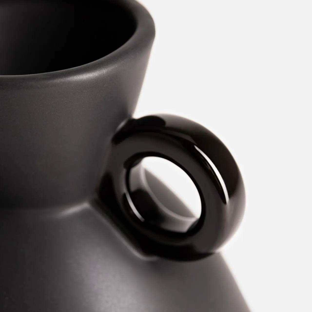 Dodaj elegancji i stylu Twojemu wnętrzu z naszym wazonem ceramicznym. Dekoracja wyróżnia się głębokim czarnym kolorem, który doskonale komponuje się z różnorodnymi aranżacjami wnętrza, za sprawą swojego minimalizmu. Oryginalny design z charakterystycznymi, okrągłymi uchwytami po bokach nadaje mu unikalnego stylu, który z pewnością przyciągnie uwagę. Idealny do ekspozycji świeżych kwiatów, gałązek czy jako samodzielny element dekoracyjny.