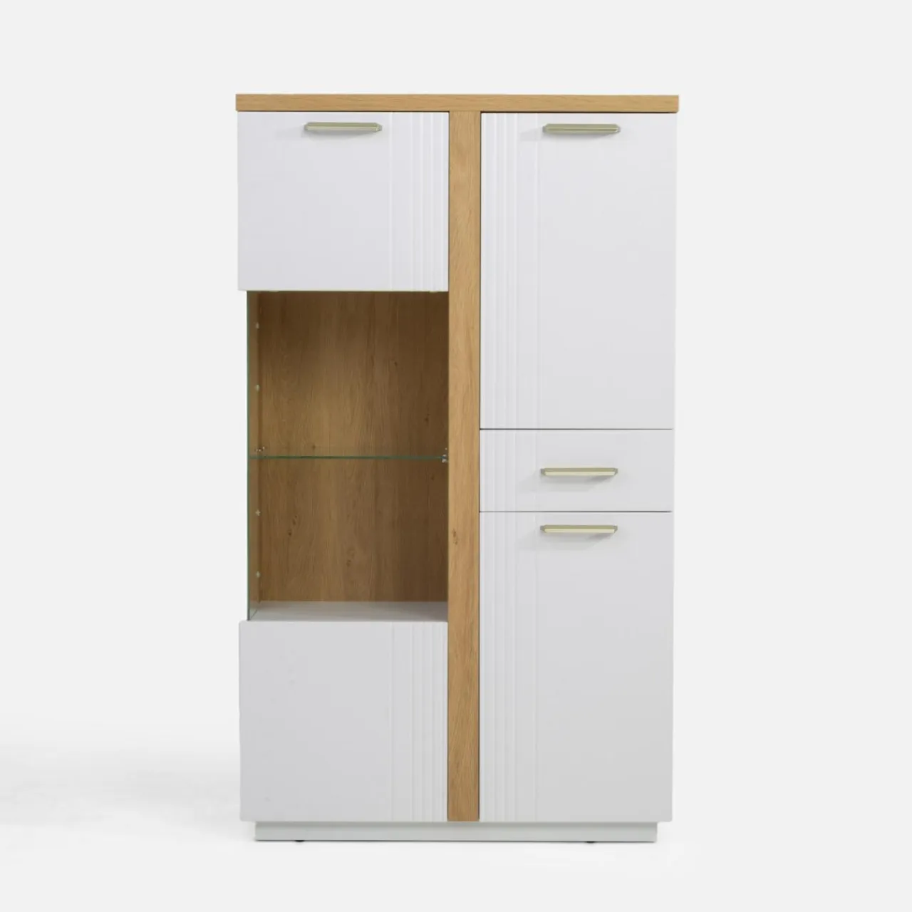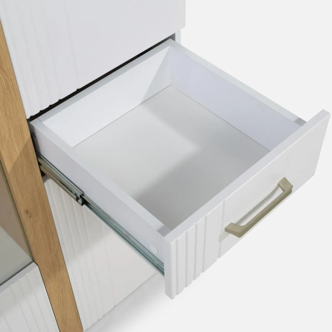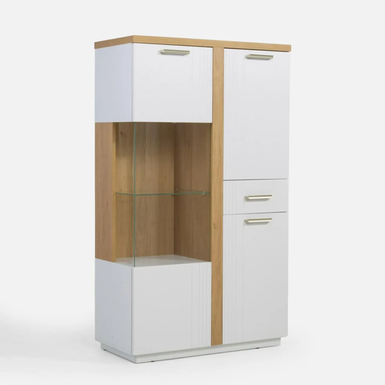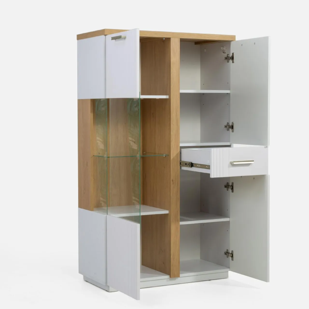 - Piękny wygląd: biała witryna z dodatkiem barwy kamiennego dębu dobrze sprawdza się w stylu nowoczesnym.