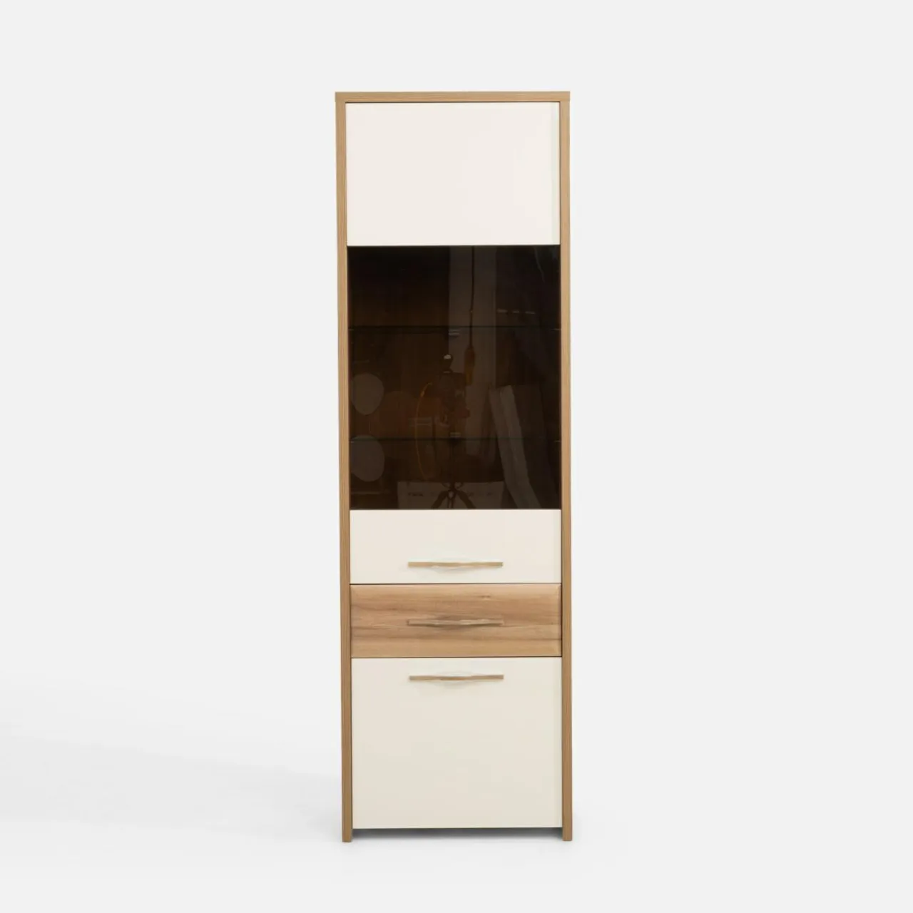 Witryna GALA to mebel, który wprowadzi nowoczesny styl do Twojego wnętrza. Połączenie dekoru drewna z beżowym wykończeniem na wysoki połysk nadaje jej wyjątkowego charakteru.