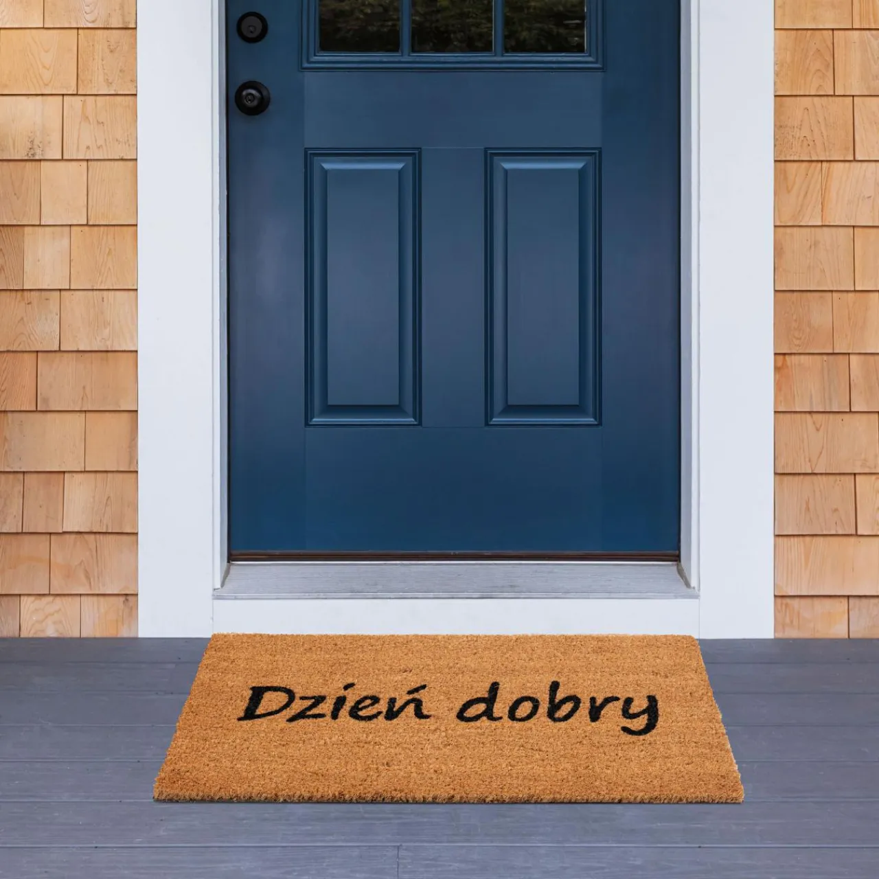 Zadbaj o czystość w swoim mieszkaniu – połóż w przedpokoju wycieraczkę kokosową w odcieniach beżu z wesołym napisem „DZIEŃ DOBRY”. Zatrzymaj brud już na etapie wejścia do mieszkania.