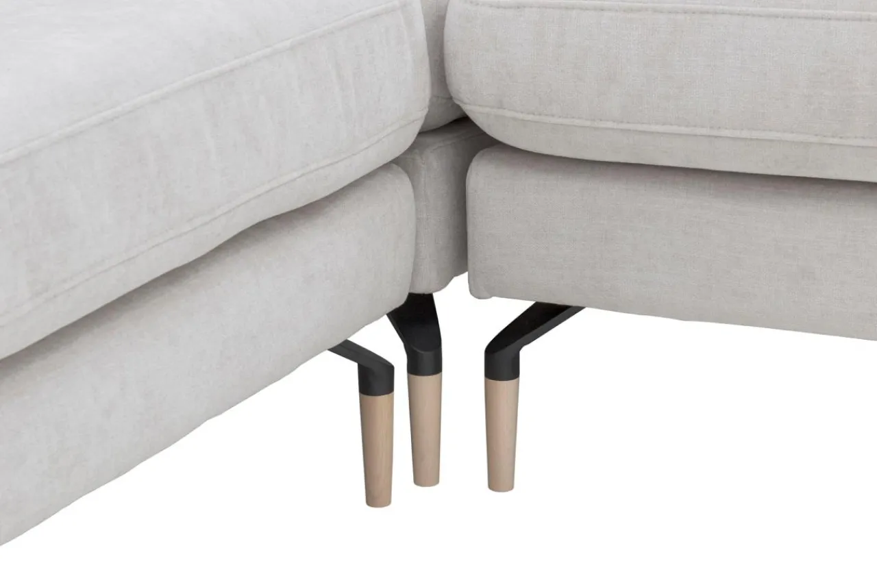 Nóżki mebla zostały wykończone w czerni ze stopkami w kolorze drewna.