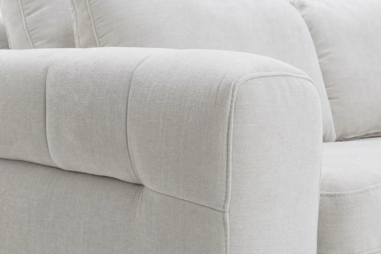 Na uwagę zasługują również poduszki oparciowe ładnie wkomponowane z bryłę mebla oraz masywne podłokietniki.
