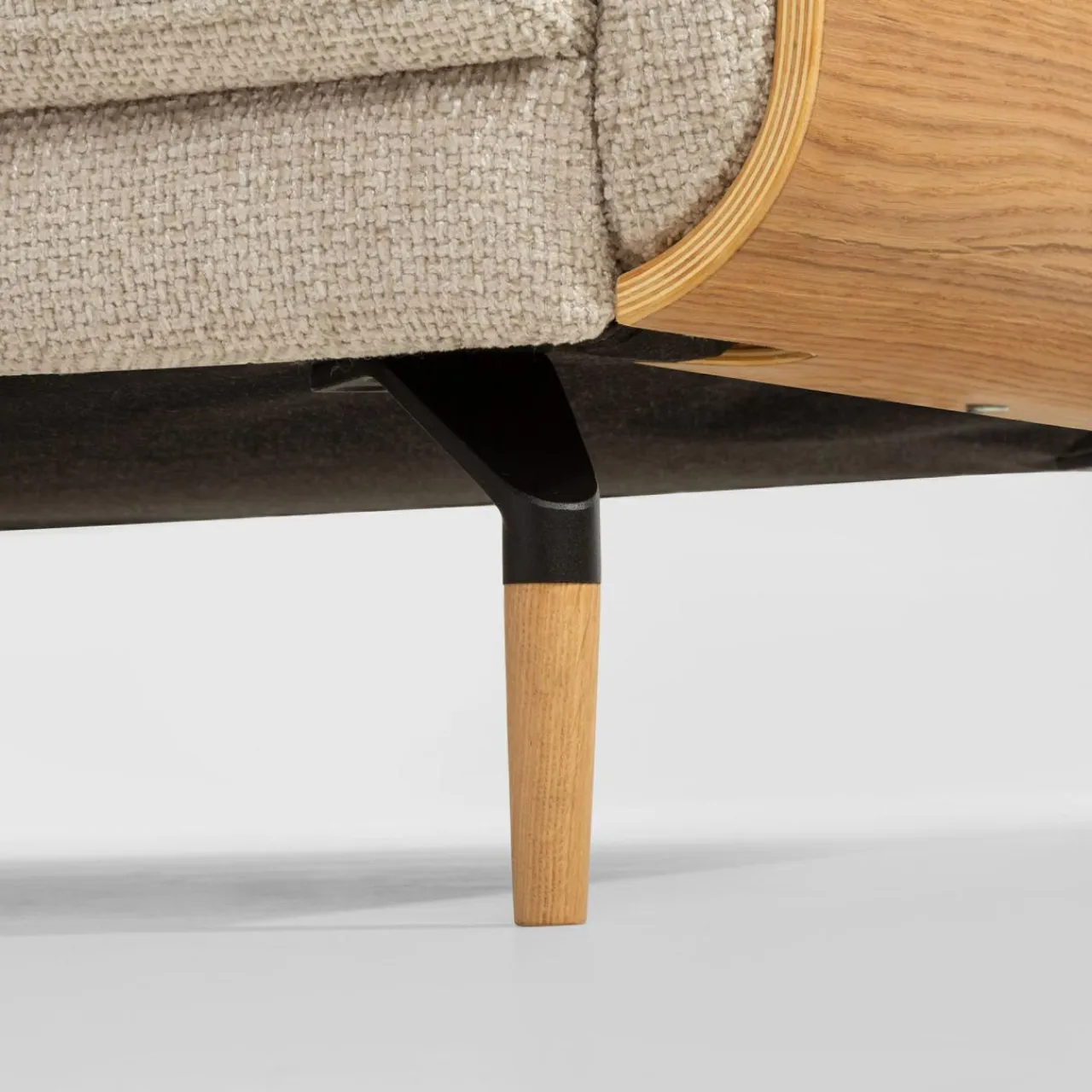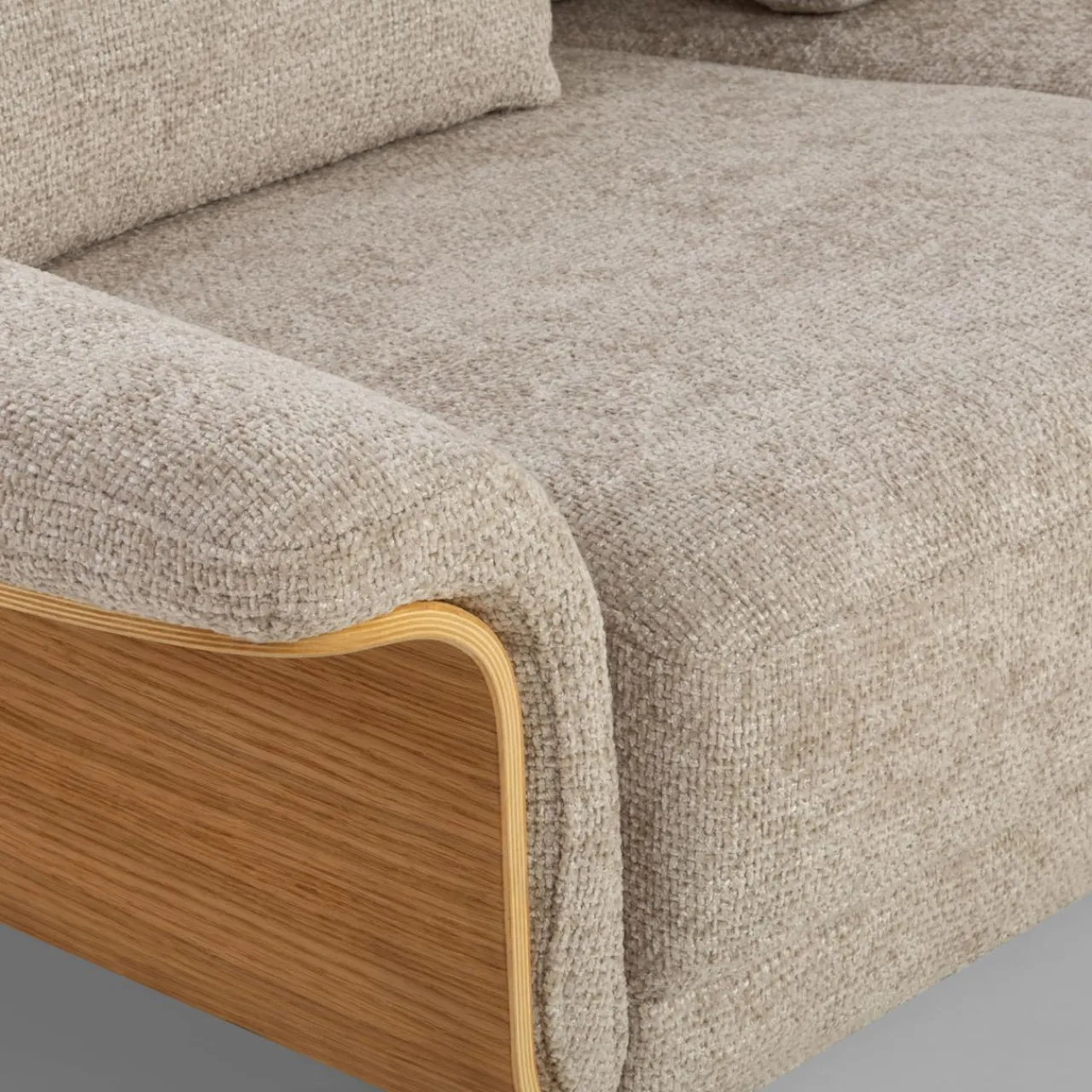 Narożnik RAMONA ma tapicerkę z miękkiego, modnego szenilu i boki w kolorze drewna. To dobry wybór do wnętrz w stylu skandynawskim i nowoczesnym.