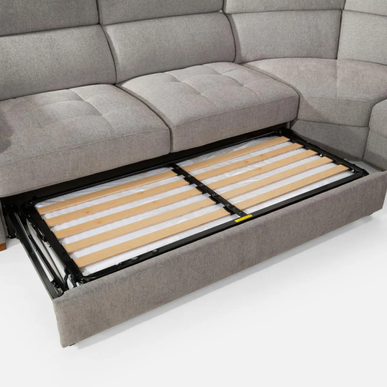 - Narożnik oferuje miejsce do spania – wysuń dolną szufladę sofy aby wyciągnąć z niej stelaż z materacem o powierzchni 140×196 cm.