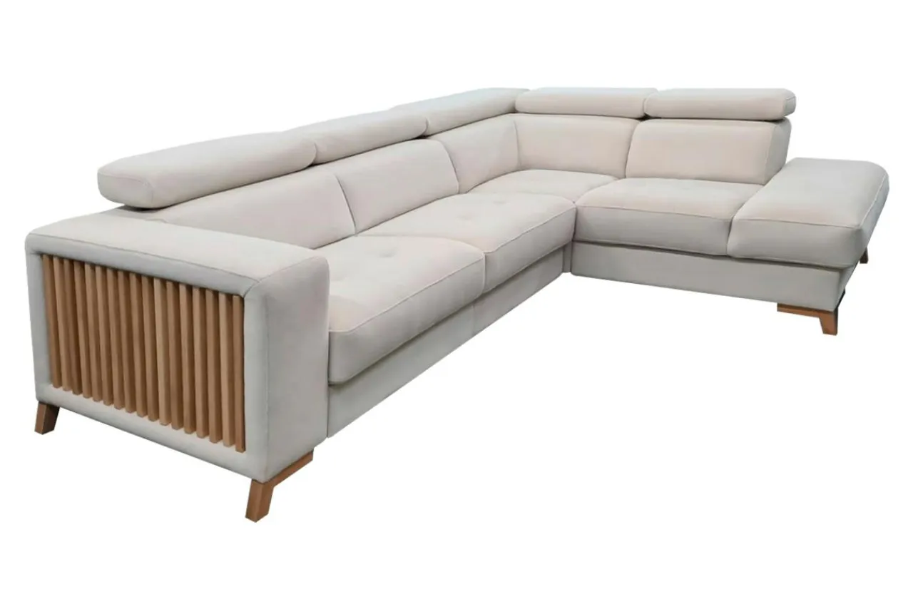 - Dekoracyjne boku z lamelami sprawiają, że narożnik świetnie zaprezentuje się we wnętrzu urządzonym w stylu japandi