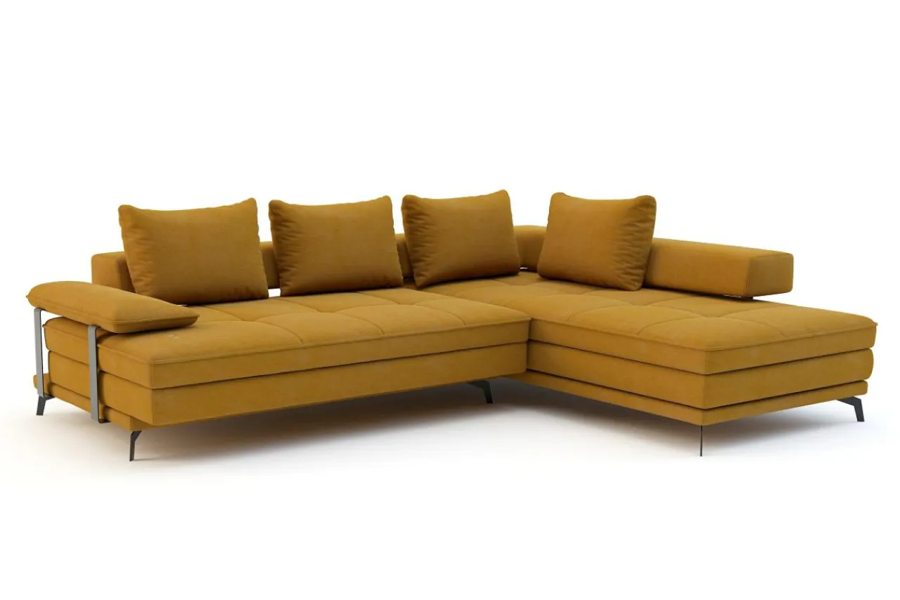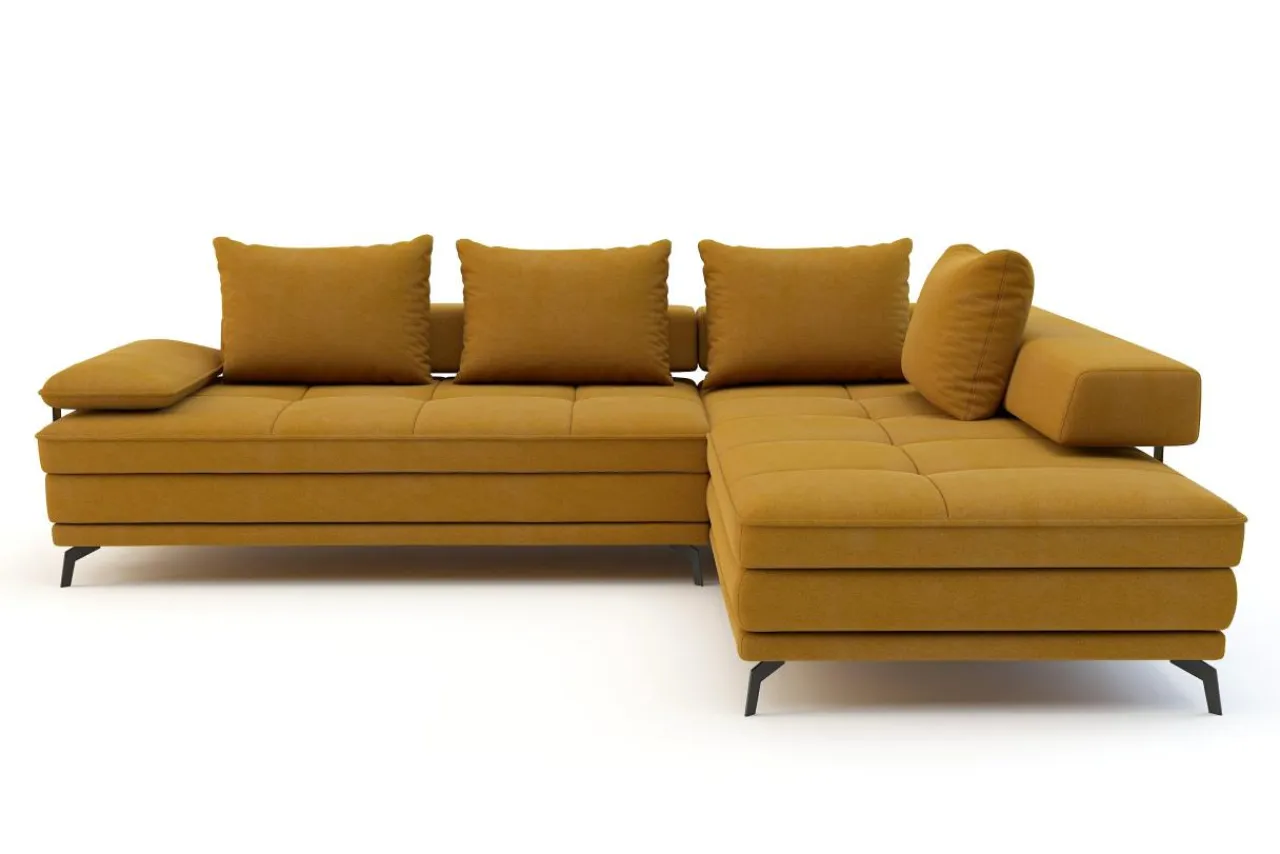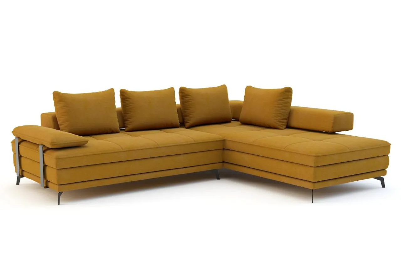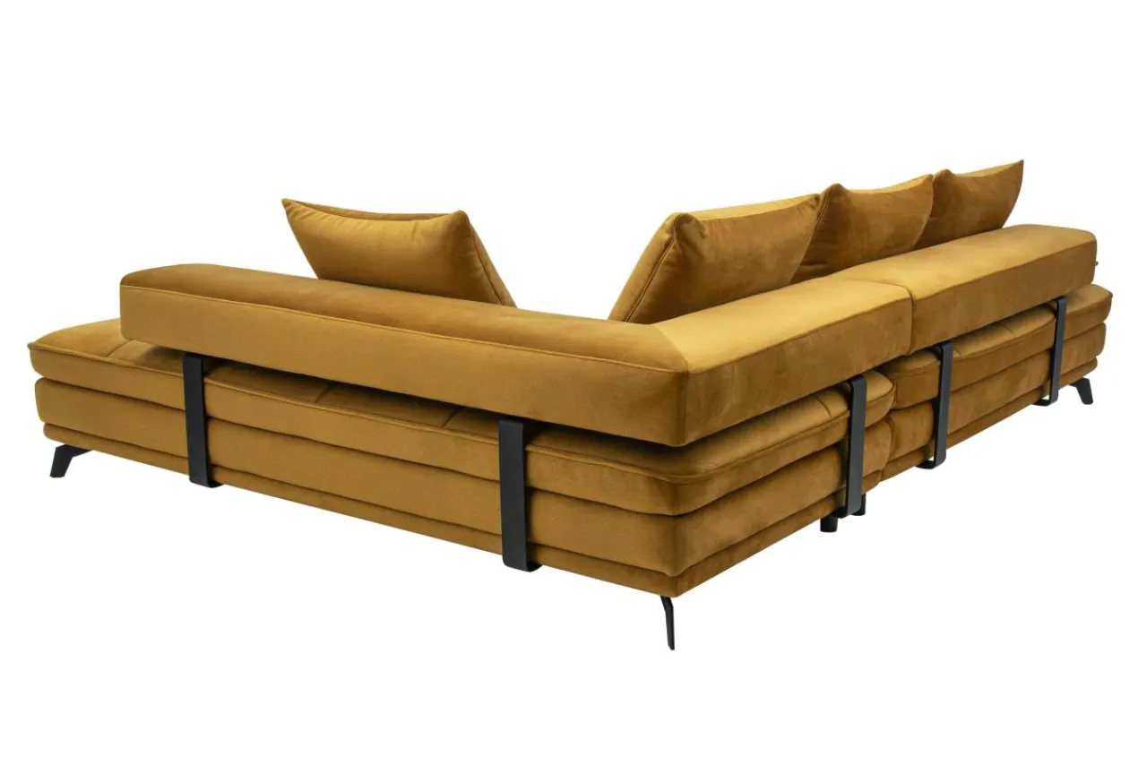 Narożnik FLORENCE w musztardowym kolorze wykończony surowymi, metalowymi obiciami przukuje Twoją uwagę.