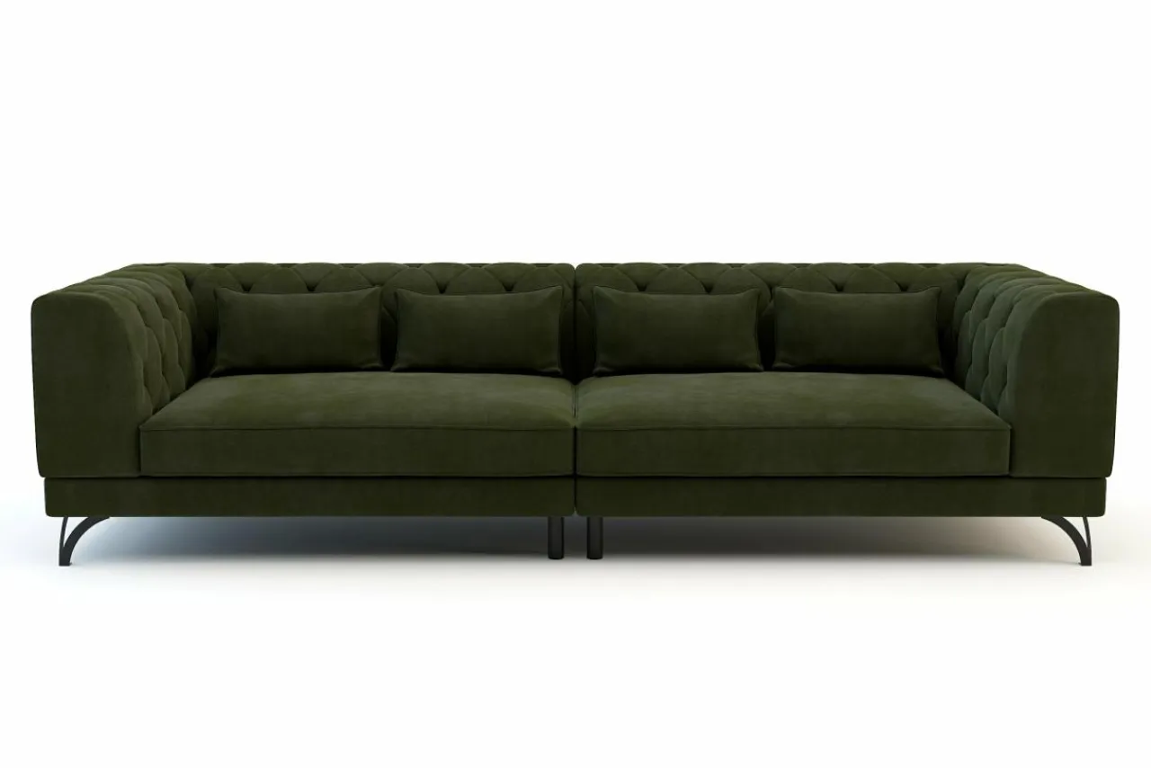 - Sofa ma pikowane oparcie, dzięki któremu przypomina sofy w typie chesterfield.