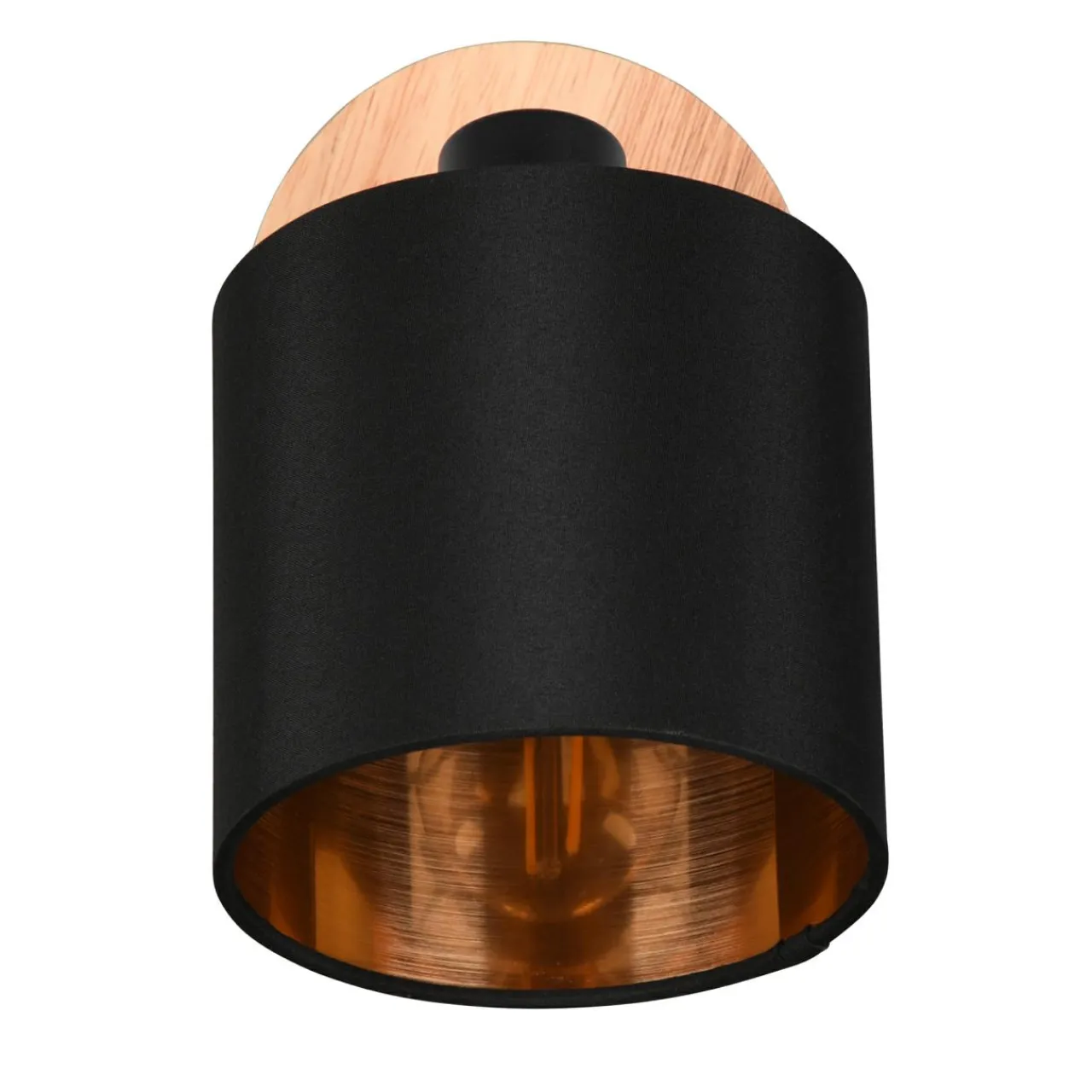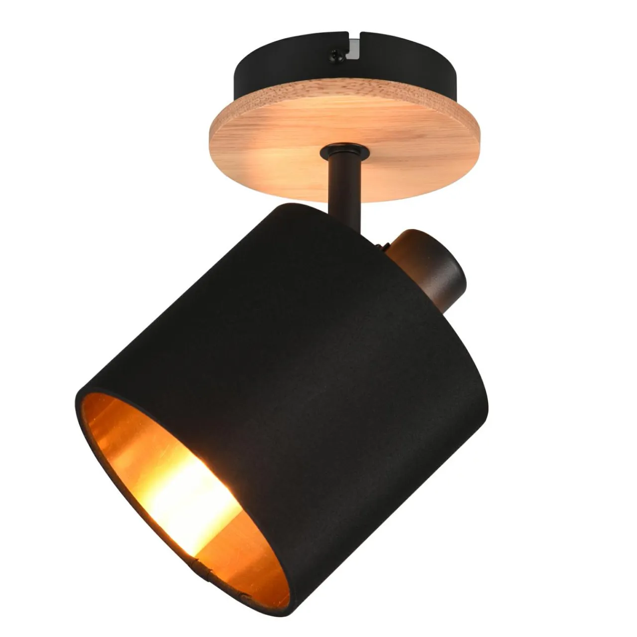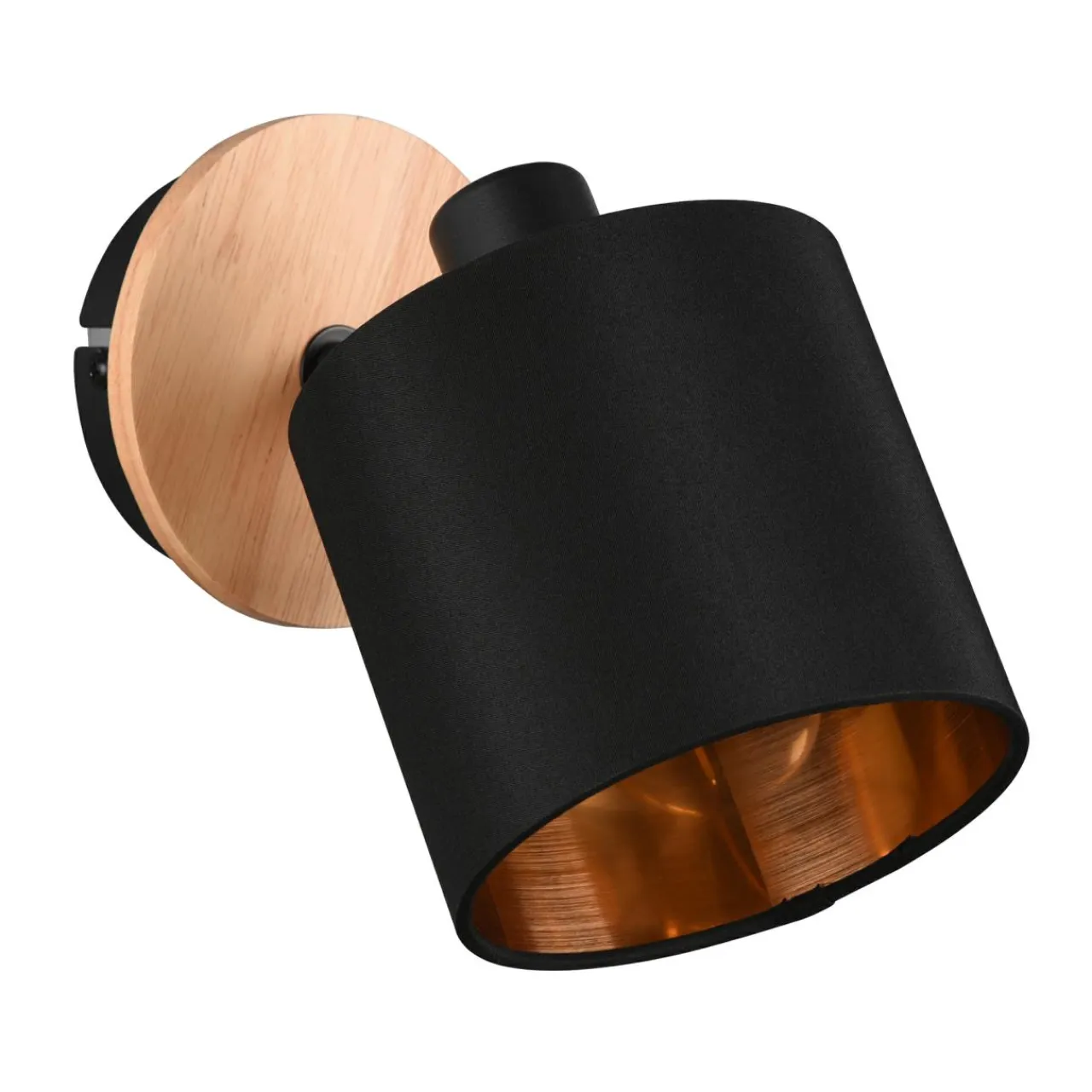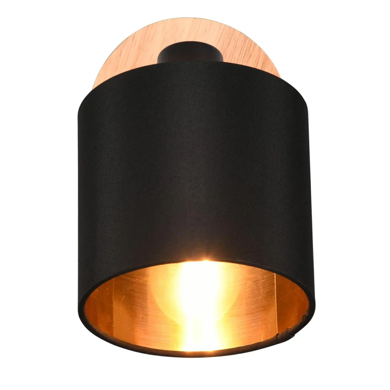 Drewniana kryza przy podstawie oraz wykończona złotym kolorem wewnętrzna część abażuru sprawia, że lampa wizualnie łączy się z wykończonymi drewnianym dekorem meblami oraz dodatkami dekoracyjnymi w ciepłej tonacji.