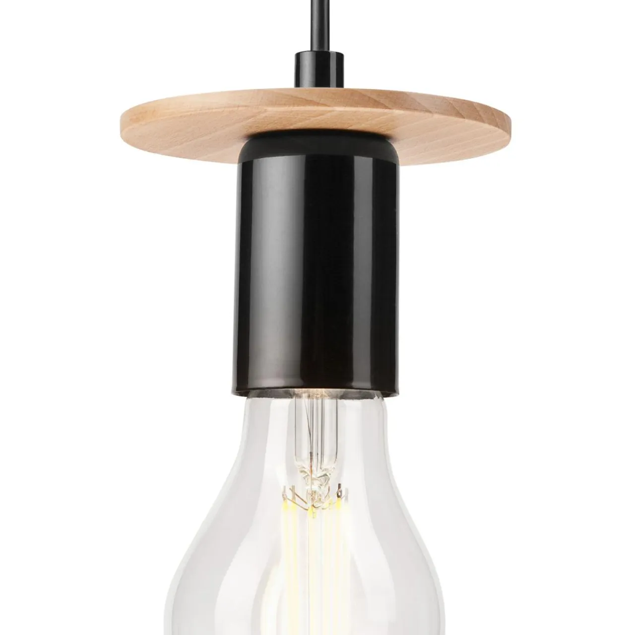 Jej czarna, matowa kolorystyka została przełamana przez drewniany element dekoracyjny wkomponowany w oprawę żarówki.