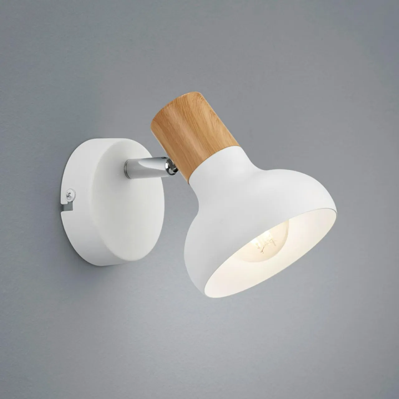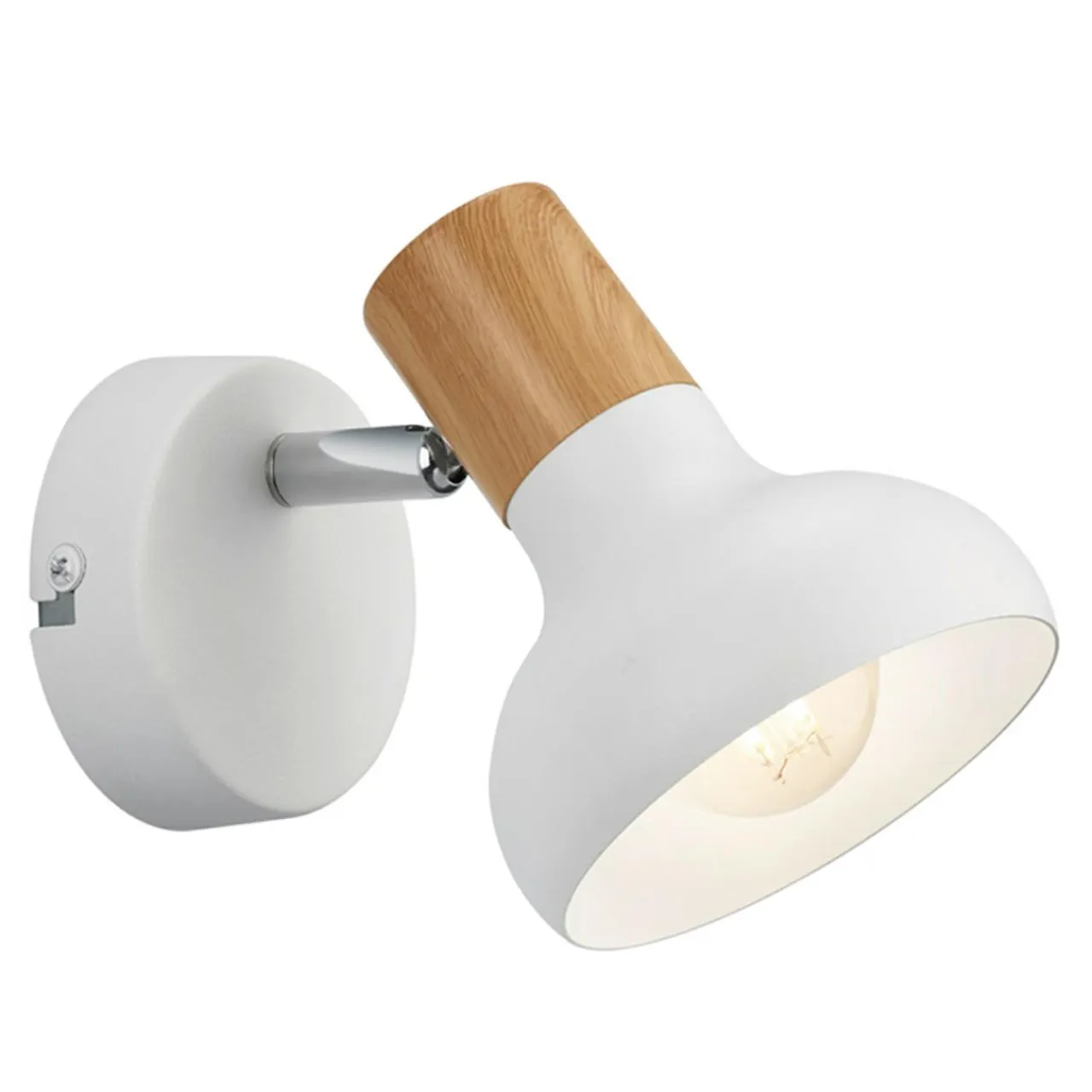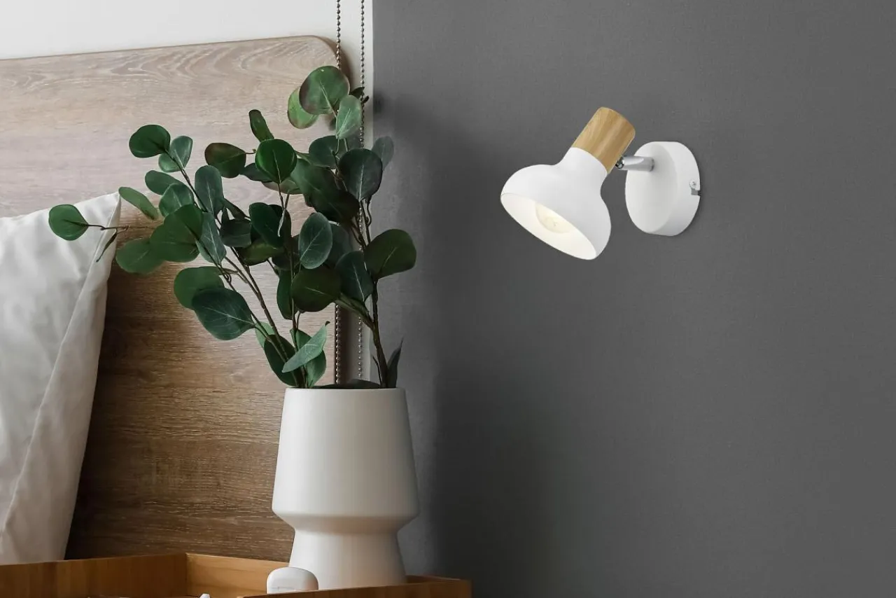 Ozdobna część w kolorze jasnego drewna połączona z matową bielą klosza i podstawy doskonale odnajdzie się w jasnym wnętrzu. Wizualnie komponuje się z ciepłą kolorystyką mebli oraz dodatków dekoracyjnych.