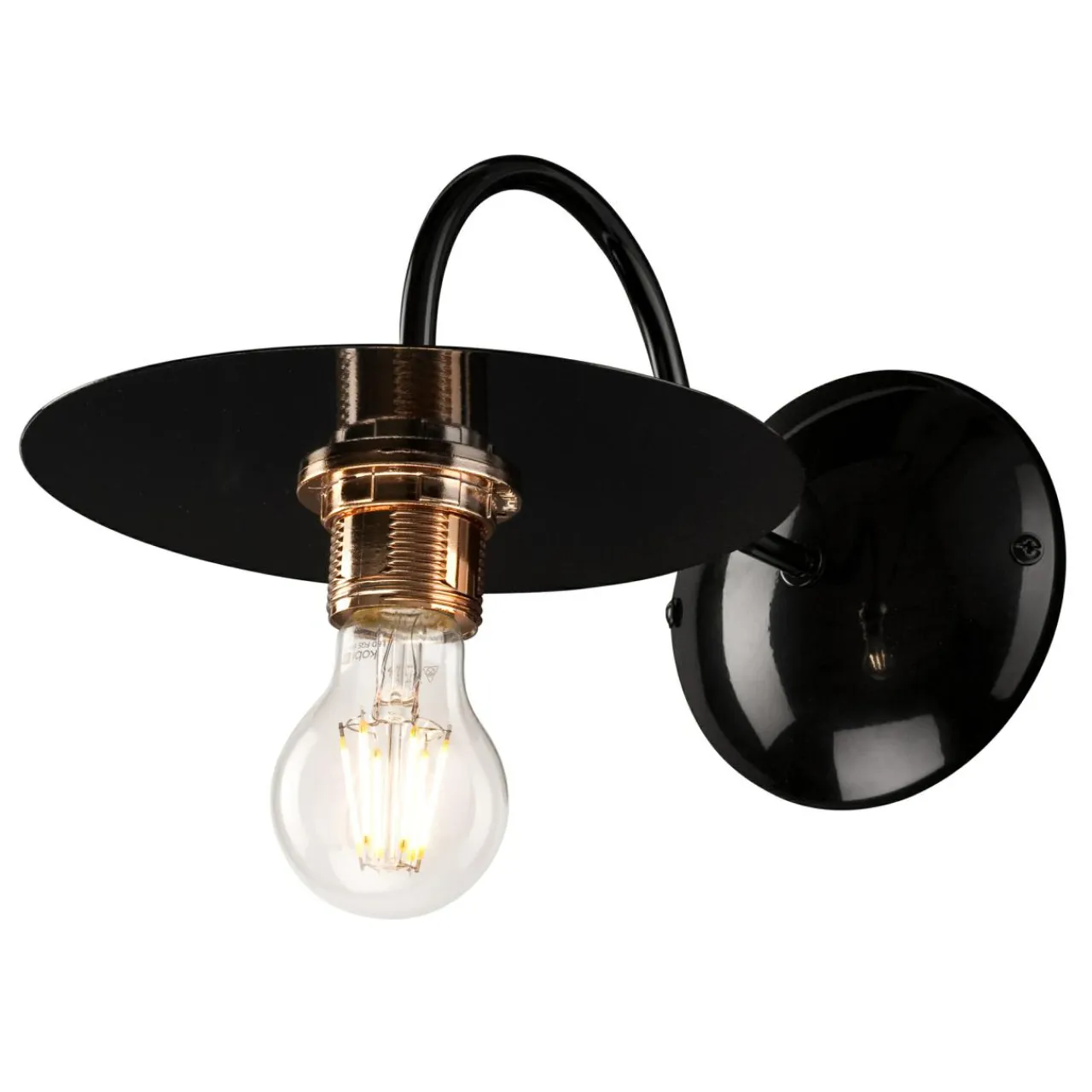 Czarne wykończenie lampy lekko błyszczy w świetle, a jednolity kolor bazy i ramienia dodatkowo podkreśla metaliczny odcień miedzi przy oprawie żarówki.