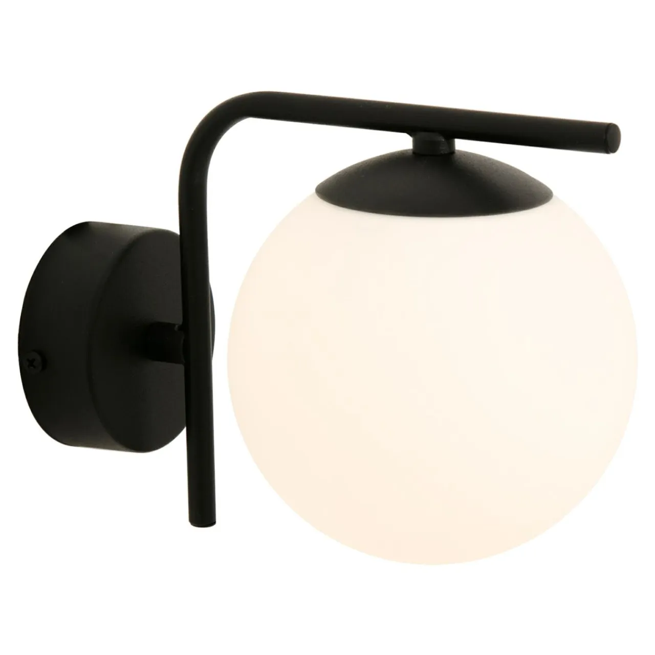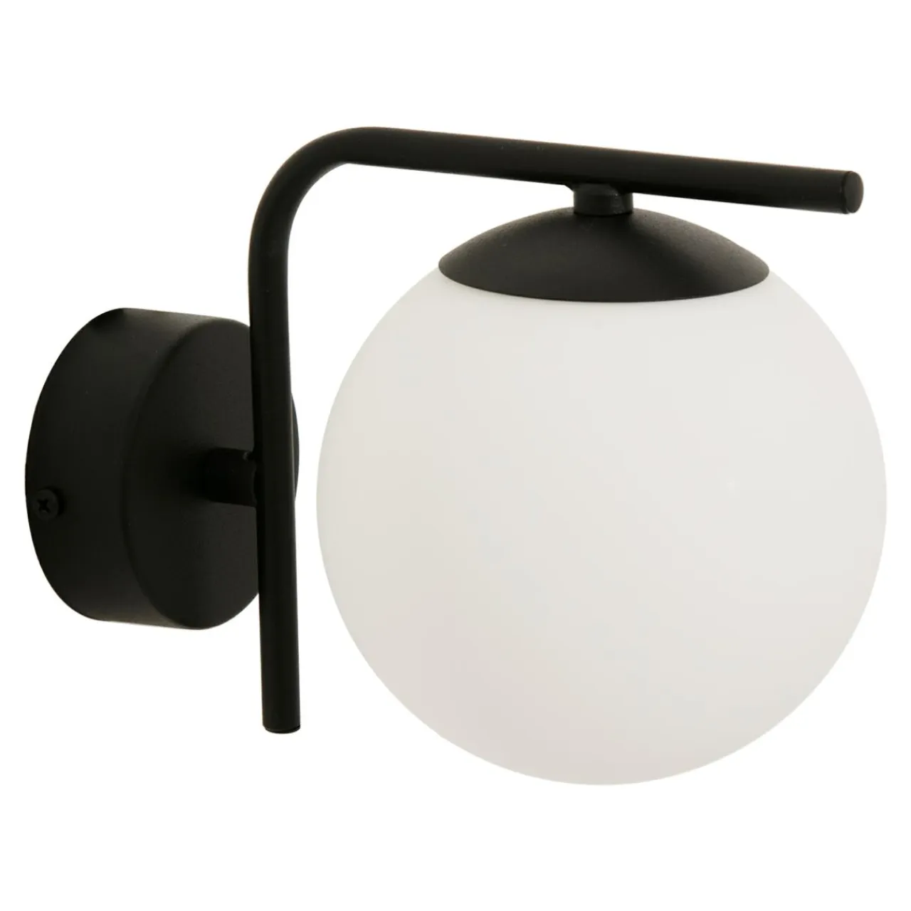 Pojedynczy mlecznobiały klosz, który wieńczy lampę całkowicie osłania żarówkę, a wykończenie bazy w czarnym kolorze nadaje całości minimalistycznego posmaku i doskonale koresponduje z meblami w odcieniach szarości, czerni i bieli.