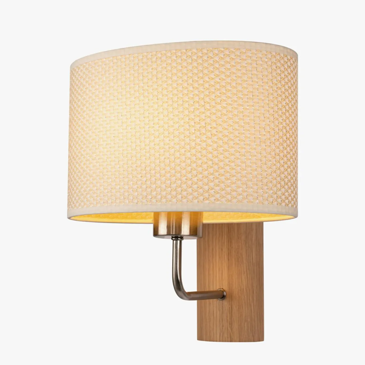 - Abażur z tkaniny o wzorze plecionki, który dodaje lampie oryginalnego wykończenia.
