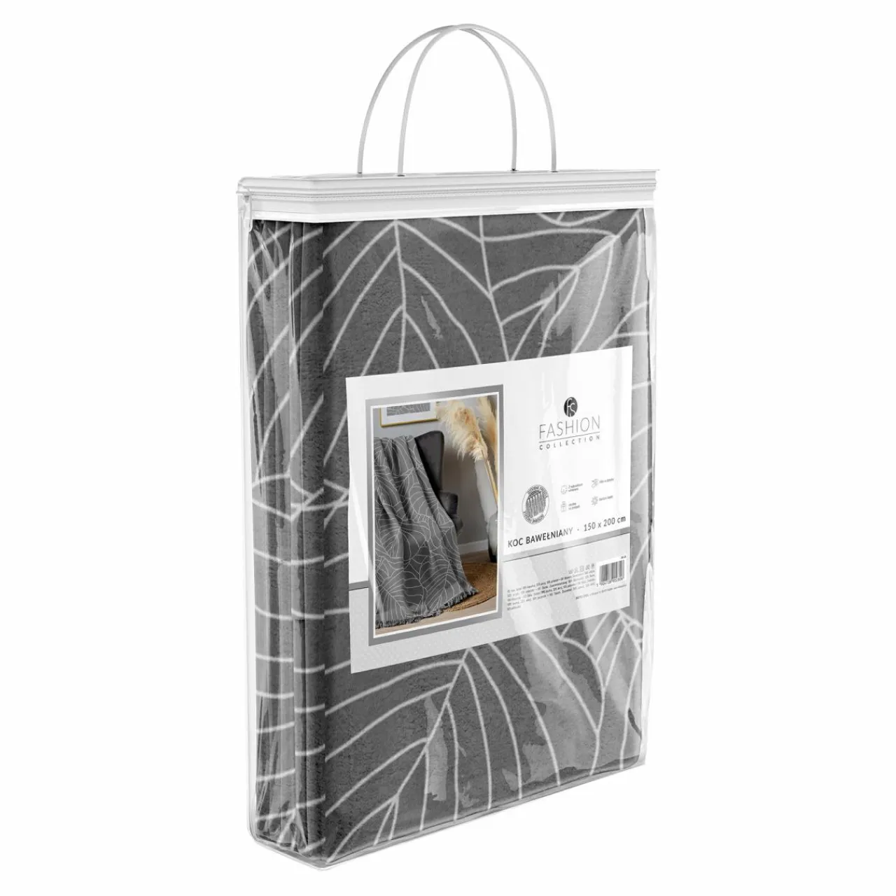 Bawełniany ciemnoszary koc z wzorem liści otuli Cię w zimną noc!