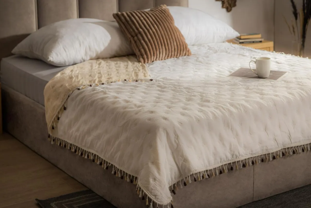 Twoja sypialnia będzie wyglądać schludniej i elegancko, jeśli na zaścieloną pościel położysz narzutę na łóżko FRINGLE. Kiedy się na niej ułożysz lub nią przykryjesz, łatwiej Ci będzie zasnąć i odpocząć.