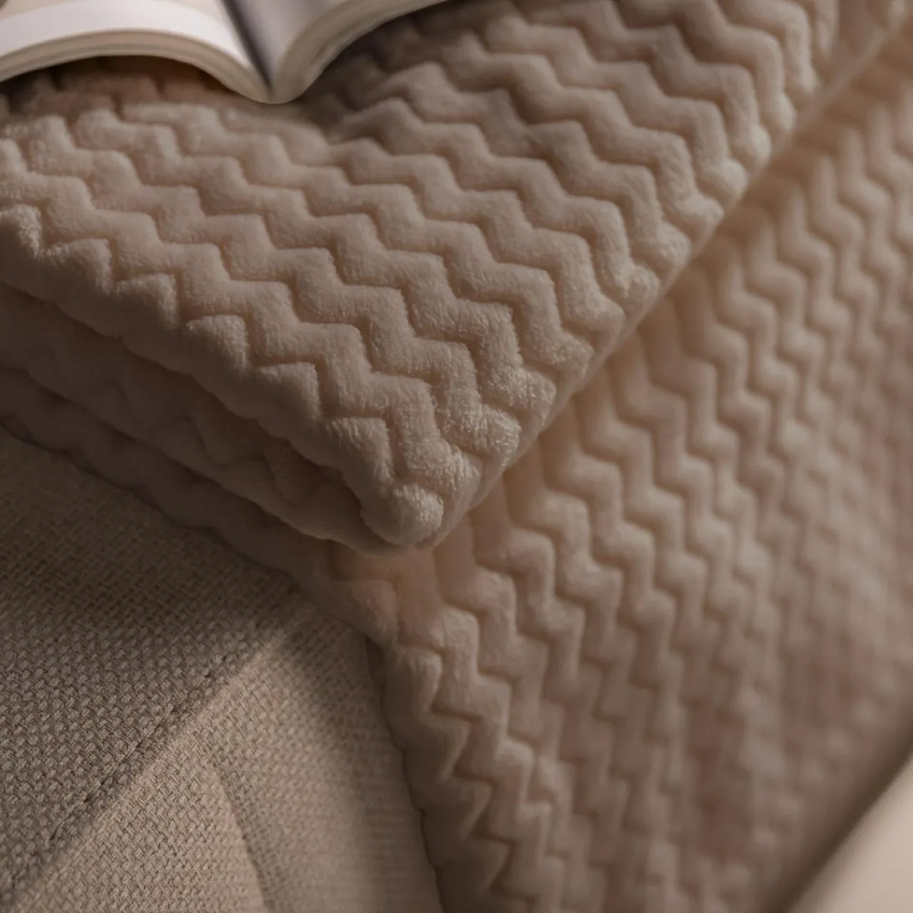 - Faktura tkaniny układa się w subtelny wzór zygzaka wyróżniając koc estetycznie;