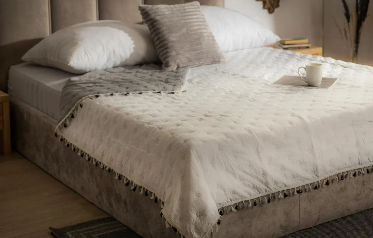 Twoja sypialnia będzie wyglądać schludniej i elegancko, jeśli na zaścieloną pościel położysz narzutę na łóżko FRINGLE. Kiedy się na niej ułożysz lub nią przykryjesz, łatwiej będzie Ci zasnąć oraz odpocząć.