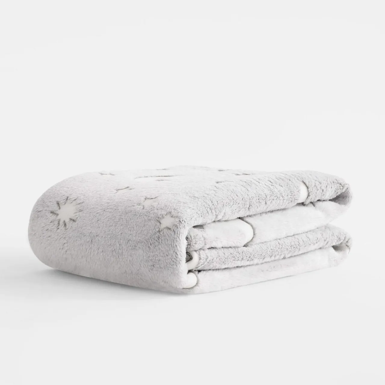 Miękki koc GLOVY w szarym kolorze ozdobi łóżko lub wersalkę w sypialni.