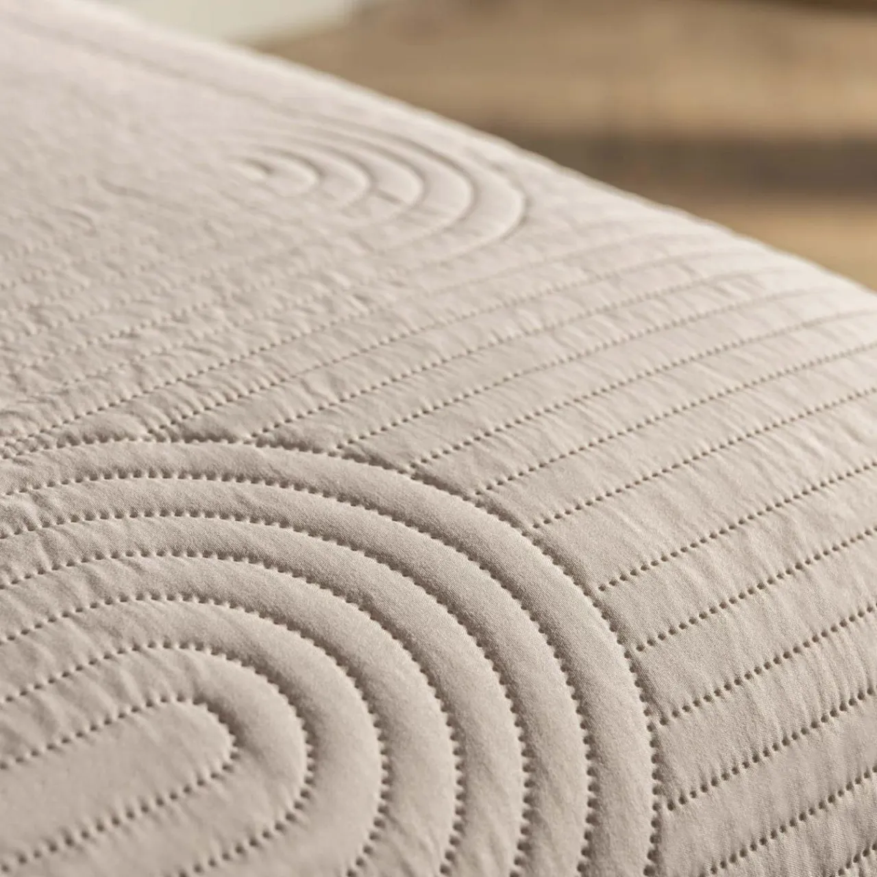 Beżowa narzuta na łóżko z kolekcji TOSCA zwraca uwagę geometrycznymi półkolistymi liniami.