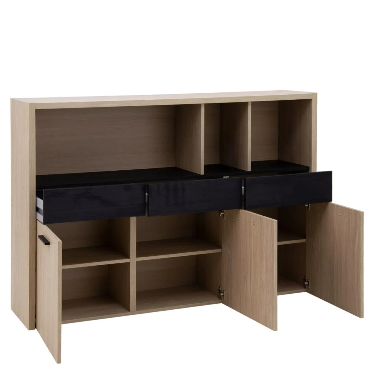 - Czarne wstawki i fronty sprawiają, że komoda prezentuje się elegancko.