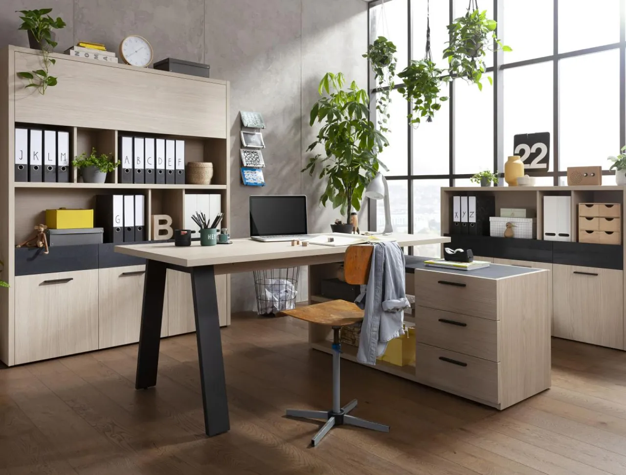 Minimalistyczny styl mebli pozwoli Ci skupić się na pracy, a połączenie barw: jasnego drewna i czerni wprowadzi do wnętrza przytulność w eleganckim stylu.