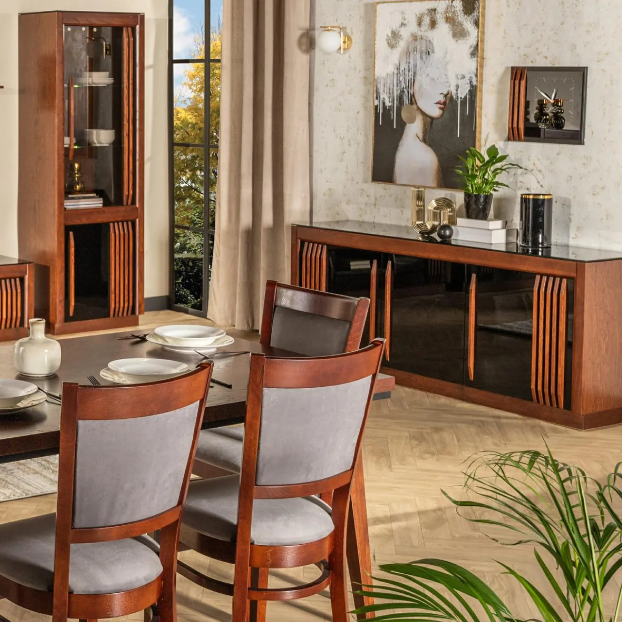 - Dzięki połączeniu czerni, ciemnego drewna i lamelom na froncie komoda wpisze się w nowoczesny styl.